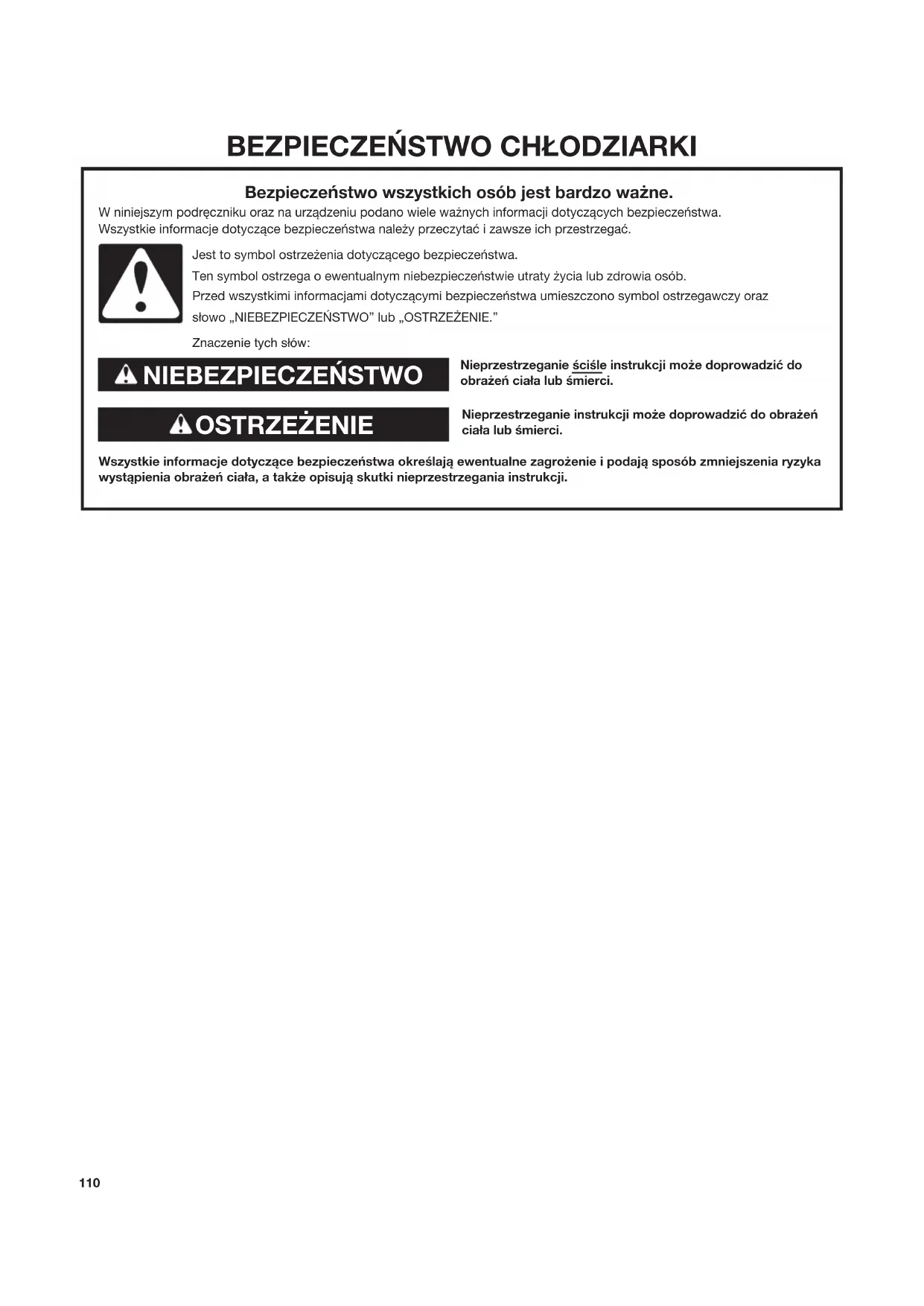 Nieprzestrzeganie ściśle instrukcji mo¿e doprowadziæ do obra¿eñ cia³a lub śmierci.Nieprzestrzeganie instrukcji mo¿e doprowadziæ do obra¿eñ cia³a lub śmierci.Wszystkie informacje dotycz¹ce bezpieczeñstwa określaj¹ ewentualne zagro¿enie i podaj¹ sposób zmniejszenia ryzyka wyst¹pienia obra¿eñ cia³a, a tak¿e opisuj¹ skutki nieprzestrzegania instrukcji. Bezpieczeñstwo wszystkich osób jest bardzo wa¿ne. W niniejszym podrêczniku oraz na urz¹dzeniu podano wiele wa¿nych informacji dotycz¹cych bezpieczeñstwa. Wszystkie informacje dotycz¹ce bezpieczeñstwa nale¿y przeczytaæ i zawsze ich przestrzegaæ.Jest to symbol ostrze¿enia dotycz¹cego bezpieczeñstwa.Ten symbol ostrzega o ewentualnym niebezpieczeñstwie utraty ¿ycia lub zdrowia osób.Przed wszystkimi informacjami dotycz¹cymi bezpieczeñstwa umieszczono symbol ostrzegawczy oraz s³owo „NIEBEZPIECZEÑSTWO” lub „OSTRZE¯ENIE.”Znaczenie tych słów: NIEBEZPIECZEÑSTWO OSTRZE¯ENIE111