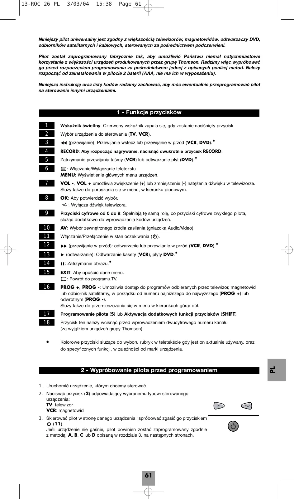 13-ROC 26 PL 3/03/04 15:38 Page 61 Niniejszy pilot uniwersalny jest zgodny z większością telewizorów, magnetowidów, odtwarzaczy DVD, odbiorników satelitarnych i kablowych, sterowanych za pośrednictwem podczerwieni. Pilot został zaprogramowany fabrycznie tak, aby umożliwić Państwu niemal natychmiastowe korzystanie z większości urządzeń produkowanych przez grupę Thomson. Radzimy więc wypróbować go przed rozpoczęciem programowania za pośrednictwem jednej z opisanych poniżej metod. Naleýy rozpoczˆ• od zainstalowania w pilocie 2 baterii (AAA, nie ma ich w wyposaýeniu). Niniejszą instrukcję oraz listę kodów radzimy zachować, aby móc ewentualnie przeprogramować pilot na sterowanie innymi urządzeniami.