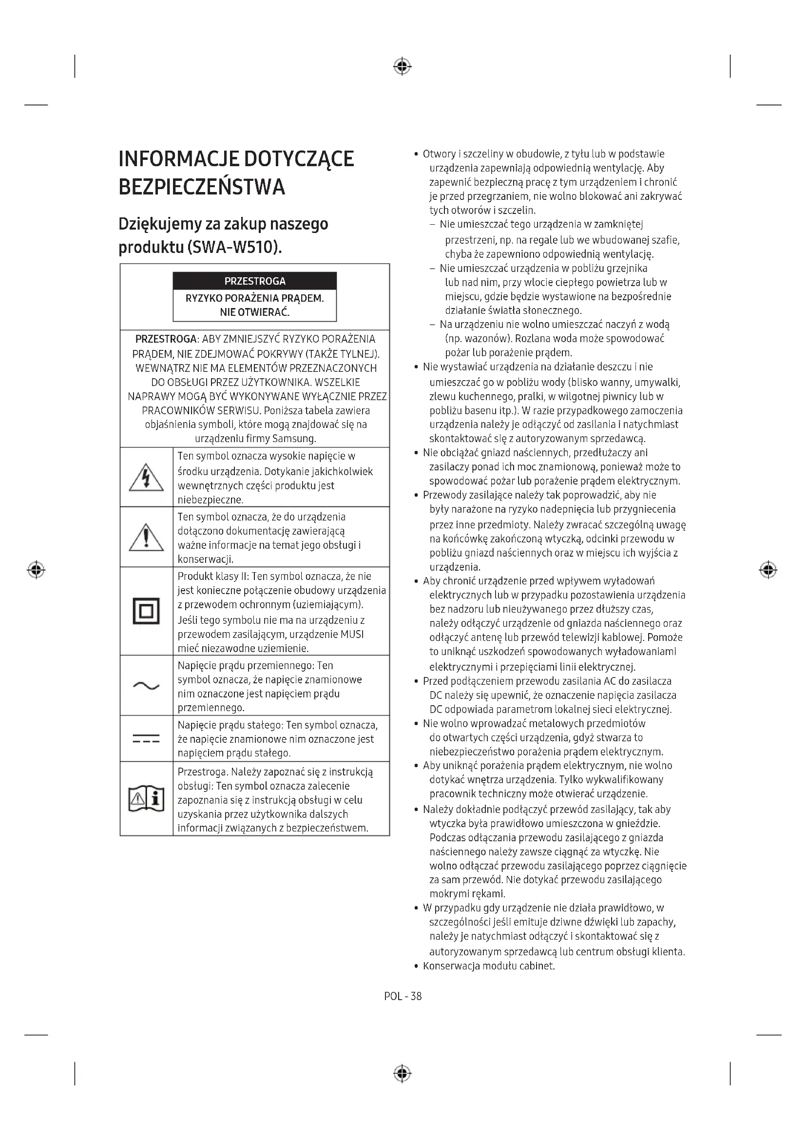 BEZPIECZEŃSTWA Dziękujemy za zakup naszego produktu (SWA-W510). PRZESTROGA RYZYKO PORAŻENIA PRĄDEM. NIE OTWIERAĆ.