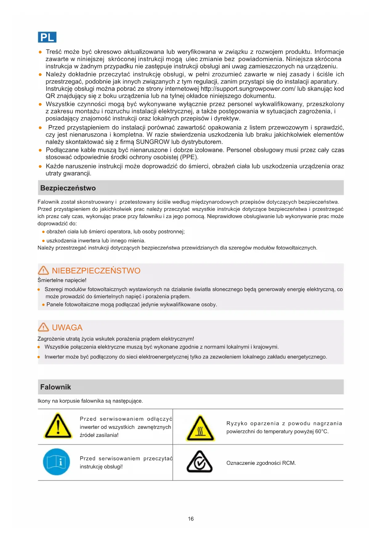● Treść może być okresowo aktualizowana lub werykowana w związku z rozwojem produktu. Informacje zawarte w niniejszej skróconej instrukcji mogą ulec zmianie bez powiadomienia. Niniejsza skrócona instrukcja w żadnym przypadku nie zastępuje instrukcji obsługi ani uwag zamieszczonych na urządzeniu. ● Należy dokładnie przeczytać instrukcję obsługi, w pełni zrozumieć zawarte w niej zasady i ściśle ich przestrzegać, podobnie jak innych związanych z tym regulacji, zanim przystąpi się do instalacji aparatury. Instrukcję obsługi można pobrać ze strony internetowej http://support.sungrowpower.com/ lub skanując kod QR znajdujący się z boku urządzenia lub na tylnej okładce niniejszego dokumentu. ● Wszystkie czynności mogą być wykonywane wyłącznie przez personel wykwalifikowany, przeszkolony z zakresu montażu i rozruchu instalacji elektrycznej, a także postępowania w sytuacjach zagrożenia, i posiadający znajomość instrukcji oraz lokalnych przepisów i dyrektyw. ● Przed przystąpieniem do instalacji porównać zawartość opakowania z listem przewozowym i sprawdzić, czy jest nienaruszona i kompletna. W razie stwierdzenia uszkodzenia lub braku jakichkolwiek elementów należy skontaktować się z rmą SUNGROW lub dystrybutorem. ● Podłączane kable muszą być nienaruszone i dobrze izolowane. Personel obsługowy musi przez cały czas stosować odpowiednie środki ochrony osobistej (PPE). ● Każde naruszenie instrukcji może doprowadzić do śmierci, obrażeń ciała lub uszkodzenia urządzenia oraz utraty gwarancji. Bezpieczeństwo Falownik został skonstruowany i przetestowany ściśle według międzynarodowych przepisów dotyczących bezpieczeństwa. Przed przystąpieniem do jakichkolwiek prac należy przeczytać wszystkie instrukcje dotyczące bezpieczeństwa i przestrzegać ich przez cały czas, wykonując prace przy falowniku i za jego pomocą. Nieprawidłowe obsługiwanie lub wykonywanie prac może doprowadzić do: ● obrażeń ciała lub śmierci operatora, lub osoby postronnej; ● uszkodzenia inwertera lub innego mienia. Należy przestrzegać instrukcji dotyczących bezpieczeństwa przewidzianych dla szeregów modułów fotowoltaicznych. NIEBEZPIECZEŃSTWO Śmiertelne napięcie! ● Szeregi modułów fotowoltaicznych wystawionych na działanie światła słonecznego będą generowały energię elektryczną, co może prowadzić do śmiertelnych napięć i porażenia prądem. ● Panele fotowoltaiczne mogą podłączać jedynie wykwalikowane osoby. UWAGA Zagrożenie utratą życia wskutek porażenia prądem elektrycznym! ● Wszystkie połączenia elektryczne muszą być wykonane zgodnie z normami lokalnymi i krajowymi. ● Inwerter może być podłączony do sieci elektroenergetycznej tylko za zezwoleniem lokalnego zakładu energetycznego. Falownik Ikony na korpusie falownika są następujące. Przed serwisowaniem odłączyć inwerter od wszystkich zewnętrznych źródeł zasilania! Ryzyko oparzenia z powodu nagrzania powierzchni do temperatury powyżej 60°C. Przed serwisowaniem przeczytać instrukcję obsługi! Oznaczenie zgodności RCM.17 Zagrożenie utraty życia z powodu wysokich napięć! Tylko wykwalifikowany personel może otwierać i serwisować falownik. Zagrożenie utraty życia z powodu wysokich napięć! Przez 10 minut od odłączenia od źródeł zasilania nie wolno dotykać części pod napięciem. Oznaczenie zgodności TÜV. Oznaczenie zgodności CE. Importer do UE/EOG. Nie utylizować falownika razem z odpadami komunalnymi