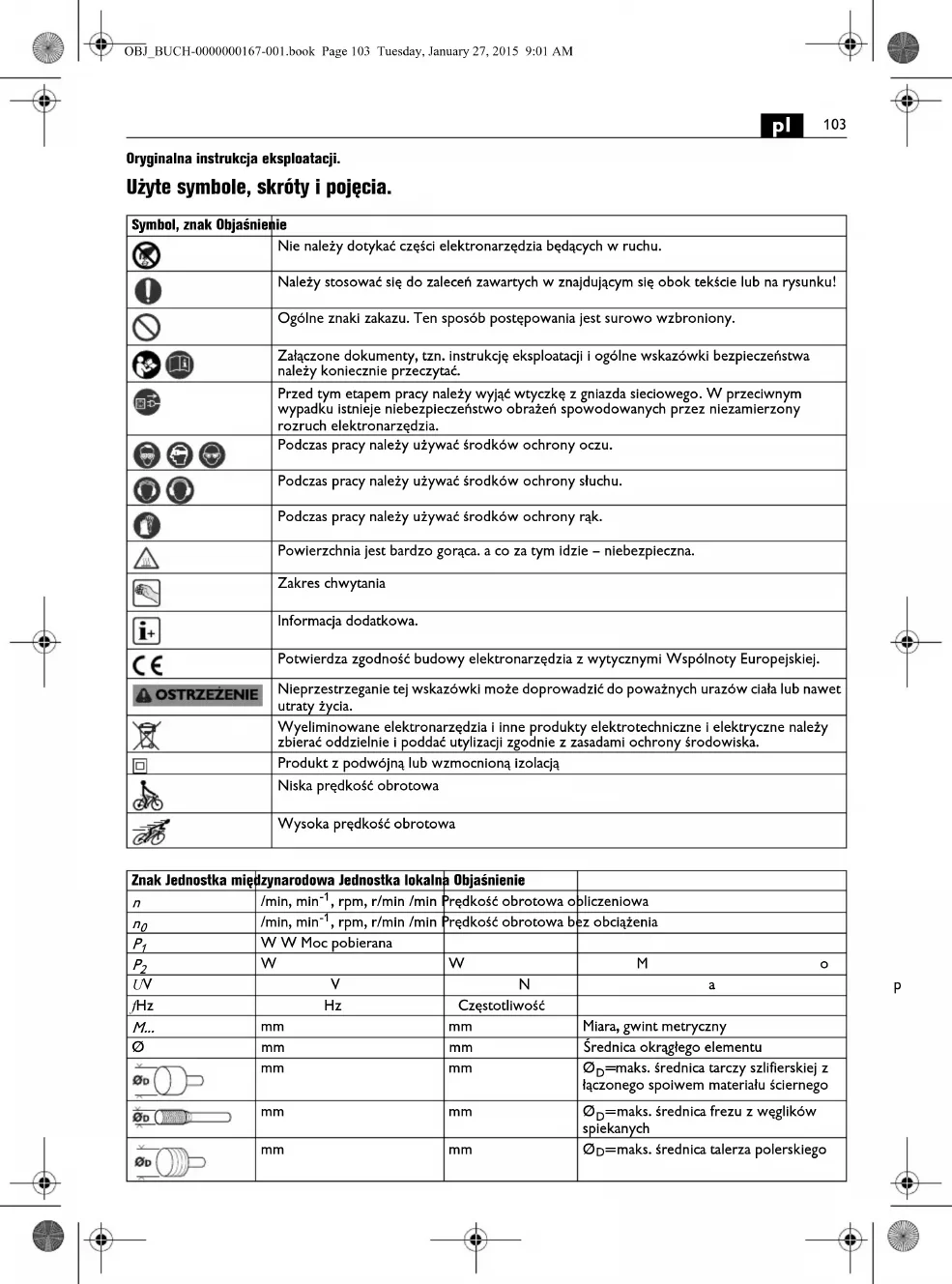 Oryginalna instrukcja eksploatacji. Użyte symbole, skróty i pojęcia. Symbol, znak Objaśnienie Nie należy dotykać części elektronarzędzia będących w ruchu. Należy stosować się do zaleceń zawartych w znajdującym się obok tekście lub na rysunku! Ogólne znaki zakazu. Ten sposób postępowania jest surowo wzbroniony. Załączone dokumenty, tzn. instrukcję eksploatacji i ogólne wskazówki bezpieczeństwa należy koniecznie przeczytać. Przed tym etapem pracy należy wyjąć wtyczkę z gniazda sieciowego. W przeciwnym wypadku istnieje niebezpieczeństwo obrażeń spowodowanych przez niezamierzony rozruch elektronarzędzia. Podczas pracy należy używać środków ochrony oczu. Podczas pracy należy używać środków ochrony słuchu. Podczas pracy należy używać środków ochrony rąk. Powierzchnia jest bardzo gorąca. a co za tym idzie – niebezpieczna. Zakres chwytania Informacja dodatkowa. Potwierdza zgodność budowy elektronarzędzia z wytycznymi Wspólnoty Europejskiej. Nieprzestrzeganie tej wskazówki może doprowadzić do poważnych urazów ciała lub nawet utraty życia. Wyeliminowane elektronarzędzia i inne produkty elektrotechniczne i elektryczne należy zbierać oddzielnie i poddać utylizacji zgodnie z zasadami ochrony środowiska. Produkt z podwójną lub wzmocnioną izolacją Niska prędkość obrotowa Wysoka prędkość obrotowa Znak Jednostka międzynarodowa Jednostka lokalna Objaśnienie
