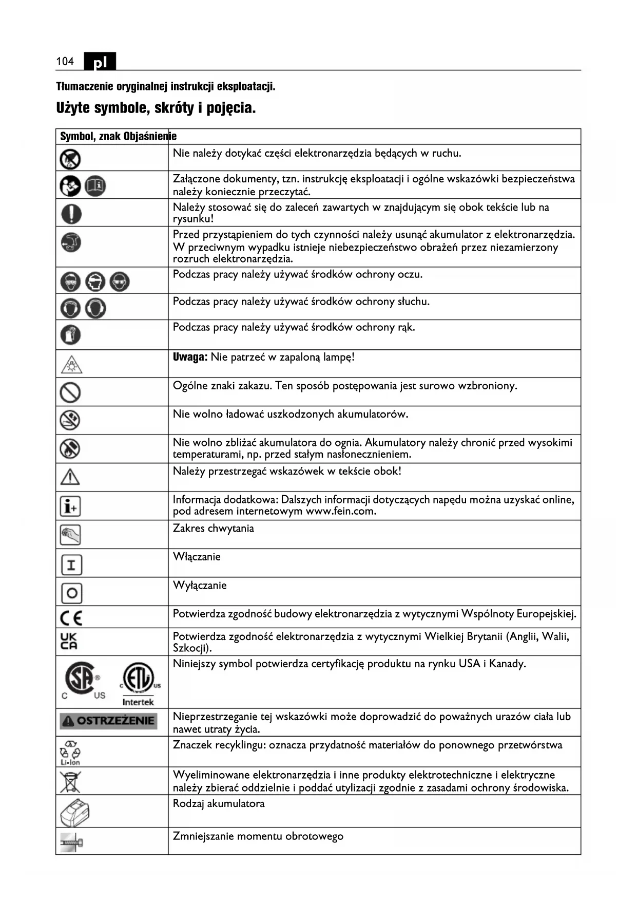 Tłumaczenie oryginalnej instrukcji eksploatacji. Użyte symbole, skróty i pojęcia. Symbol, znak Objaśnienie Nie należy dotykać części elektronarzędzia będących w ruchu. Załączone dokumenty, tzn. instrukcję eksploatacji i ogólne wskazówki bezpieczeństwa należy koniecznie przeczytać. Należy stosować się do zaleceń zawartych w znajdującym się obok tekście lub na rysunku! Przed przystąpieniem do tych czynności należy usunąć akumulator z elektronarzędzia. W przeciwnym wypadku istnieje niebezpieczeństwo obrażeń przez niezamierzony rozruch elektronarzędzia. Podczas pracy należy używać środków ochrony oczu. Podczas pracy należy używać środków ochrony słuchu. Podczas pracy należy używać środków ochrony rąk. Uwaga: Nie patrzeć w zapaloną lampę! Ogólne znaki zakazu. Ten sposób postępowania jest surowo wzbroniony. Nie wolno ładować uszkodzonych akumulatorów. Nie wolno zbliżać akumulatora do ognia. Akumulatory należy chronić przed wysokimi temperaturami, np. przed stałym nasłonecznieniem. Należy przestrzegać wskazówek w tekście obok! Informacja dodatkowa: Dalszych informacji dotyczących napędu można uzyskać online, pod adresem internetowym www.fein.com. Zakres chwytania Włączanie Wyłączanie Potwierdza zgodność budowy elektronarzędzia z wytycznymi Wspólnoty Europejskiej. Potwierdza zgodność elektronarzędzia z wytycznymi Wielkiej Brytanii (Anglii, Walii, Szkocji). Niniejszy symbol potwierdza certyfikację produktu na rynku USA i Kanady. Nieprzestrzeganie tej wskazówki może doprowadzić do poważnych urazów ciała lub nawet utraty życia. Znaczek recyklingu: oznacza przydatność materiałów do ponownego przetwórstwa Wyeliminowane elektronarzędzia i inne produkty elektrotechniczne i elektryczne należy zbierać oddzielnie i poddać utylizacji zgodnie z zasadami ochrony środowiska. Rodzaj akumulatora Zmniejszanie momentu obrotowego105