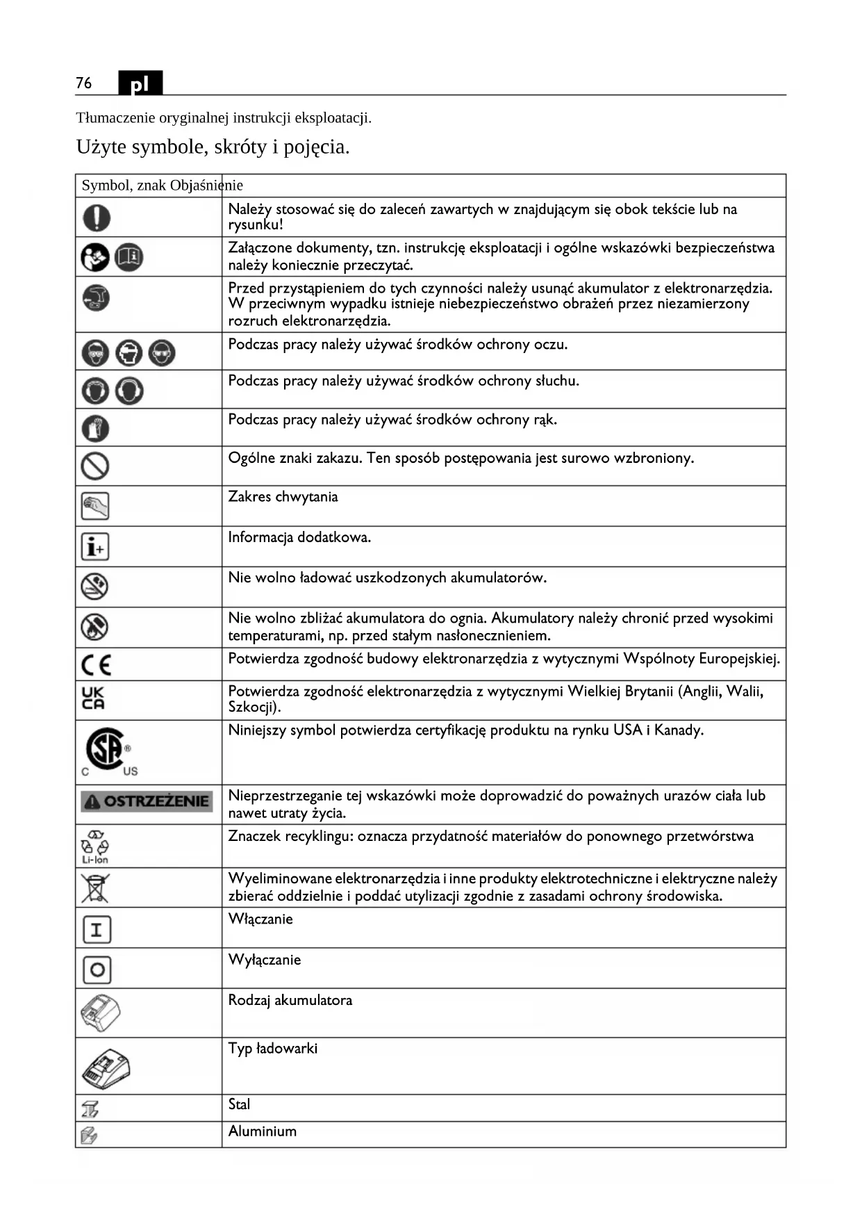 Tłumaczenie oryginalnej instrukcji eksploatacji. Użyte symbole, skróty i pojęcia. Symbol, znak Objaśnienie Należy stosować się do zaleceń zawartych w znajdującym się obok tekście lub na rysunku! Załączone dokumenty, tzn. instrukcję eksploatacji i ogólne wskazówki bezpieczeństwa należy koniecznie przeczytać. Przed przystąpieniem do tych czynności należy usunąć akumulator z elektronarzędzia. W przeciwnym wypadku istnieje niebezpieczeństwo obrażeń przez niezamierzony rozruch elektronarzędzia. Podczas pracy należy używać środków ochrony oczu. Podczas pracy należy używać środków ochrony słuchu. Podczas pracy należy używać środków ochrony rąk. Ogólne znaki zakazu. Ten sposób postępowania jest surowo wzbroniony. Zakres chwytania Informacja dodatkowa. Nie wolno ładować uszkodzonych akumulatorów. Nie wolno zbliżać akumulatora do ognia. Akumulatory należy chronić przed wysokimi temperaturami, np. przed stałym nasłonecznieniem. Potwierdza zgodność budowy elektronarzędzia z wytycznymi Wspólnoty Europejskiej. Potwierdza zgodność elektronarzędzia z wytycznymi Wielkiej Brytanii (Anglii, Walii, Szkocji). Niniejszy symbol potwierdza certyfikację produktu na rynku USA i Kanady. Nieprzestrzeganie tej wskazówki może doprowadzić do poważnych urazów ciała lub nawet utraty życia. Znaczek recyklingu: oznacza przydatność materiałów do ponownego przetwórstwa Wyeliminowane elektronarzędzia i inne produkty elektrotechniczne i elektryczne należy zbierać oddzielnie i poddać utylizacji zgodnie z zasadami ochrony środowiska. Włączanie Wyłączanie Rodzaj akumulatora Typ ładowarki Stal Aluminium77