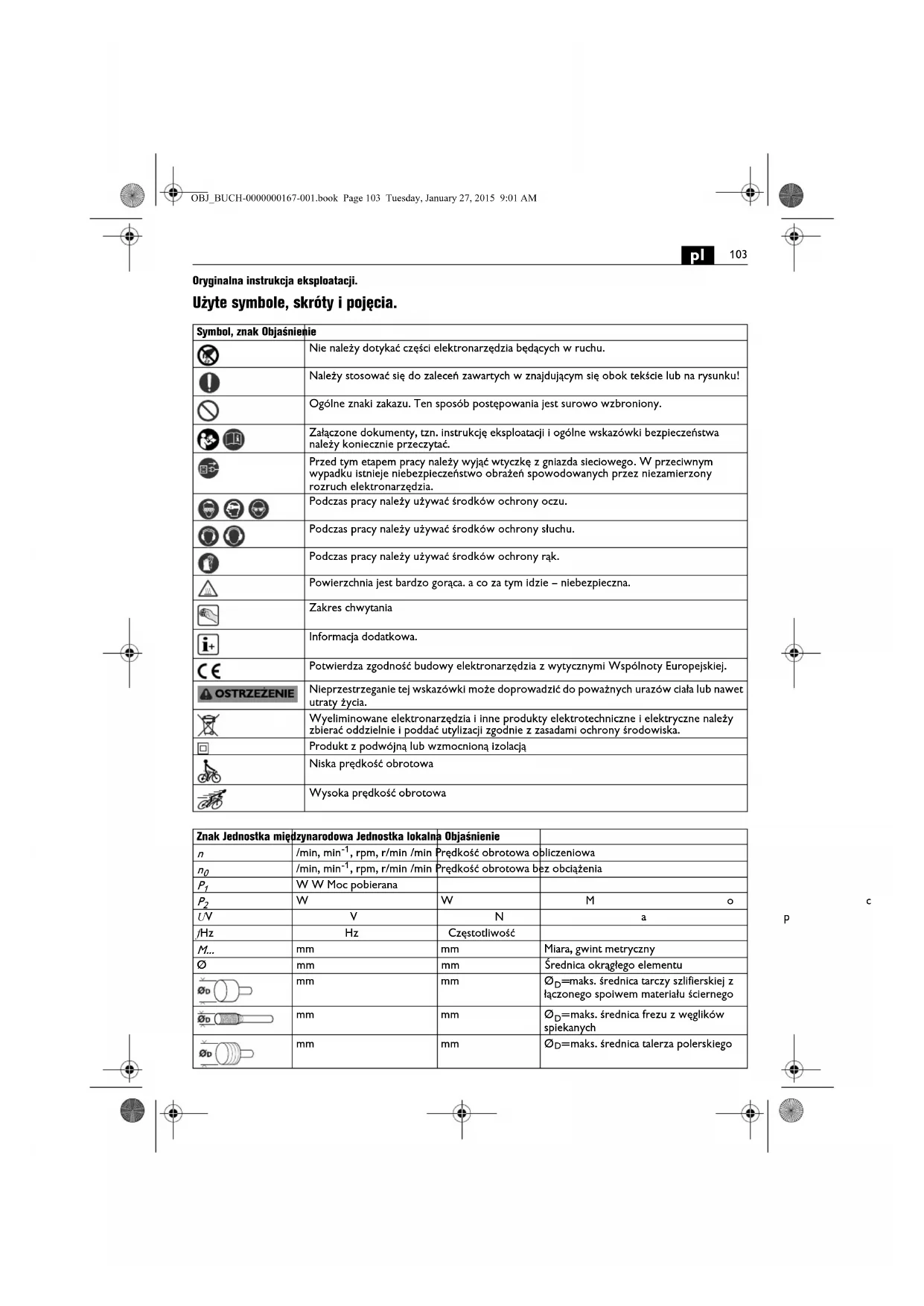 Oryginalna instrukcja eksploatacji. Użyte symbole, skróty i pojęcia. Symbol, znak Objaśnienie Nie należy dotykać części elektronarzędzia będących w ruchu. Należy stosować się do zaleceń zawartych w znajdującym się obok tekście lub na rysunku! Ogólne znaki zakazu. Ten sposób postępowania jest surowo wzbroniony. Załączone dokumenty, tzn. instrukcję eksploatacji i ogólne wskazówki bezpieczeństwa należy koniecznie przeczytać. Przed tym etapem pracy należy wyjąć wtyczkę z gniazda sieciowego. W przeciwnym wypadku istnieje niebezpieczeństwo obrażeń spowodowanych przez niezamierzony rozruch elektronarzędzia. Podczas pracy należy używać środków ochrony oczu. Podczas pracy należy używać środków ochrony słuchu. Podczas pracy należy używać środków ochrony rąk. Powierzchnia jest bardzo gorąca. a co za tym idzie – niebezpieczna. Zakres chwytania Informacja dodatkowa. Potwierdza zgodność budowy elektronarzędzia z wytycznymi Wspólnoty Europejskiej. Nieprzestrzeganie tej wskazówki może doprowadzić do poważnych urazów ciała lub nawet utraty życia. Wyeliminowane elektronarzędzia i inne produkty elektrotechniczne i elektryczne należy zbierać oddzielnie i poddać utylizacji zgodnie z zasadami ochrony środowiska. Produkt z podwójną lub wzmocnioną izolacją Niska prędkość obrotowa Wysoka prędkość obrotowa Znak Jednostka międzynarodowa Jednostka lokalna Objaśnienie