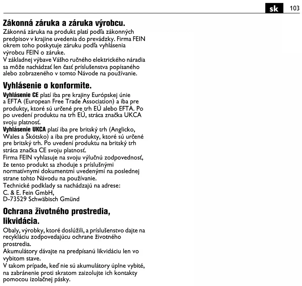 Wyrobów, który miały kontakt z azbestem nie wolno oddawać do naprawy. Wyroby skażone azbestem należy usuwać w sposób zgodny z obowiązującymi w danym kraju przepisami prawnymi dotyczącymi postępowania z azbestem. Aktualna lista części zamiennych dla niniejszego elektronarzędzia znajduje się pod adresem internetowym www.fein.com. Należy stosować wyłącznie oryginalne części zamienne. W razie potrzeby możliwa jest wymiana we własnym zakresie następujących elementów: Narzędzia robocze, akumulator, osprzęt Rękojmia i gwarancja. Rękojmia na produkt jest ważna zgodnie z ustawowymi przepisami regulującymi w kraju, w którym produkt został wprowadzony do obrotu. Oprócz tego produkt objęty jest gwarancją firmy FEIN, zgodnie z deklaracją gwarancyjną producenta. W zakres dostawy nabytego elektronarzędzia może wchodzić tylko część ukazanego na rysunkach lub opisanego w instrukcji eksploatacji osprzętu. Oświadczenie o zgodności. Oświadczenie CE dotyczy tylko krajów Unii Europejskiej oraz Europejskiego Stowarzyszenia Wolnego Handlu (EFTA) i tylko wyrobów, które przeznaczone są do rozprowadzania na rynku UE lub EFTA. Po wprowadzeniu wyrobu na rynek EU, znak UKCA traci ważność. Oświadczenie UKCA (UK Conformity Assessed) dotyczy tylko Wielkiej Brytanii (Anglii, Walii i Szkocji) i tylko wyrobów, które przeznaczone są do rozprowadzania na rynku Wielkiej Brytanii. Po wprowadzeniu wyrobu na rynek brytyjski, znak CE traci ważność. Firma FEIN oświadcza z pełną odpowiedzialnością, że niniejszy produkt zgodny jest z odpowiednimi postanowieniami podanymi na ostatniej stronie niniejszej instrukcji eksploatacji. Dokumentacja techniczna: C. & E. Fein GmbH, C-D1_IA, D-73529 Schwäbisch Gmünd Ochrona środowiska, usuwanie odpadów. Opakowanie, zużyte elektronarzędzia i osprzęt należy dostarczyć do utylizacji zgodnie z przepisami z ochrony środowiska. Akumulatory należy oddawać do punktu utylizacji w stanie rozładowanym. Jeżeli akumulator nie rozładował się całkowicie, styki należy zakleić taśmą izolującą, w celu uniknięcia zwarcia.110