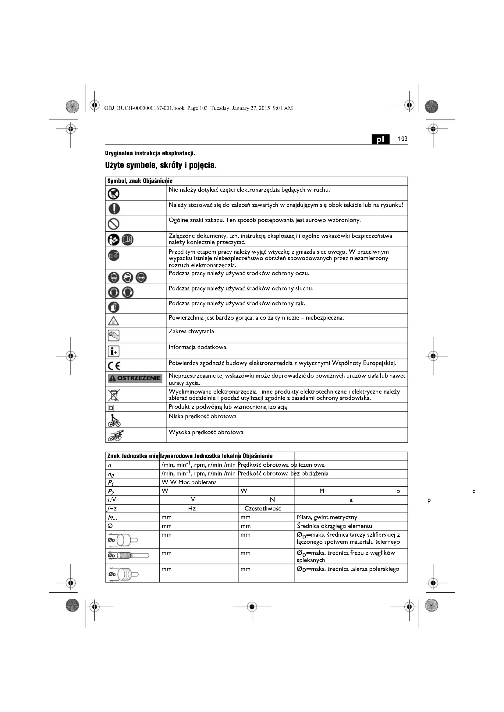 Oryginalna instrukcja eksploatacji. Użyte symbole, skróty i pojęcia. Symbol, znak Objaśnienie Nie należy dotykać części elektronarzędzia będących w ruchu. Należy stosować się do zaleceń zawartych w znajdującym się obok tekście lub na rysunku! Ogólne znaki zakazu. Ten sposób postępowania jest surowo wzbroniony. Załączone dokumenty, tzn. instrukcję eksploatacji i ogólne wskazówki bezpieczeństwa należy koniecznie przeczytać. Przed tym etapem pracy należy wyjąć wtyczkę z gniazda sieciowego. W przeciwnym wypadku istnieje niebezpieczeństwo obrażeń spowodowanych przez niezamierzony rozruch elektronarzędzia. Podczas pracy należy używać środków ochrony oczu. Podczas pracy należy używać środków ochrony słuchu. Podczas pracy należy używać środków ochrony rąk. Powierzchnia jest bardzo gorąca. a co za tym idzie – niebezpieczna. Zakres chwytania Informacja dodatkowa. Potwierdza zgodność budowy elektronarzędzia z wytycznymi Wspólnoty Europejskiej. Nieprzestrzeganie tej wskazówki może doprowadzić do poważnych urazów ciała lub nawet utraty życia. Wyeliminowane elektronarzędzia i inne produkty elektrotechniczne i elektryczne należy zbierać oddzielnie i poddać utylizacji zgodnie z zasadami ochrony środowiska. Produkt z podwójną lub wzmocnioną izolacją Niska prędkość obrotowa Wysoka prędkość obrotowa Znak Jednostka międzynarodowa Jednostka lokalna Objaśnienie