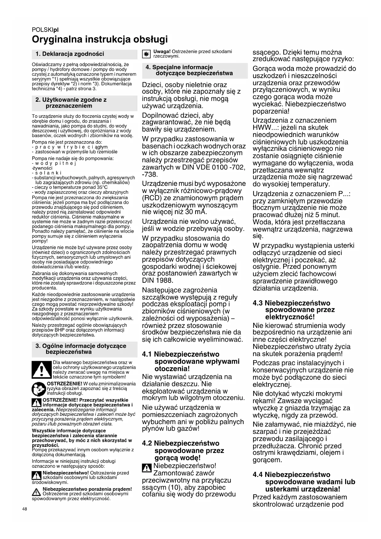 Oryginalna instrukcja obsługi Oświadczamy z pełną odpowiedzialnością, że pompy / hydrofory domowe / pompy do wody czystej z automatyką oznaczone typem i numerem seryjnym *1) spełniają wszystkie obowiązujące przepisy dyrektyw *2) i norm *3). Dokumentacja techniczna *4) - patrz strona 3. To urządzenie służy do tłoczenia czystej wody w obrębie domu i ogrodu, do zraszania i nawadniania, jako pompa do studni, do wody deszczowej i użytkowej, do opróżniania z wody basenów, oczek wodnych i zbiorników na wodę. Pompa nie jest przeznaczona do: -pracy w trybie ciągłym -zastosowań w przemyśle lub rzemiośle Pompa nie nadaje się do pompowania: -wody pitnej - żywności -solanki - substancji wybuchowych, palnych, agresywnych lub zagrażających zdrowiu (np. chemikaliów) - cieczy o temperaturze ponad 35°C - wody zapiaszczonej oraz cieczy abrazyjnych Pompa nie jest przeznaczona do zwiększania ciśnienia: jeżeli pompa ma być podłączana do przewodu znajdującego się pod ciśnieniem, należy przed nią zainstalować odpowiedni reduktor ciśnienia. Ciśnienie maksymalne w systemie nie może w żadnym razie przekroczyć podanego ciśnienia maksymalnego dla pompy. Ponadto należy pamiętać, że ciśnienie na wlocie pompy sumuje się z ciśnieniem wyłączenia pompy! Urządzenie nie może być używane przez osoby (również dzieci) o ograniczonych zdolnościach fizycznych, sensorycznych lub umysłowych ani osoby nie posiadające odpowiedniego doświadczenia i/lub wiedzy. Zabrania się dokonywania samowolnych modyfikacji urządzenia oraz używania części, które nie zostały sprawdzone i dopuszczone przez producenta. Każde nieodpowiednie zastosowanie urządzenia jest niezgodne z przeznaczeniem, w następstwie czego mogą powstać nieprzewidywalne szkody! Za szkody powstałe w wyniku użytkowania niezgodnego z przeznaczeniem odpowiedzialność ponosi wyłącznie użytkownik. Należy przestrzegać ogólnie obowiązujących przepisów BHP oraz dołączonych informacji dotyczących bezpieczeństwa. Dla własnego bezpieczeństwa oraz w celu ochrony użytkowanego urządzenia należy zwracać uwagę na miejsca w tekście oznaczone tym symbolem! OSTRZEŻENIE! W celu zminimalizowania ryzyka obrażeń zapoznać się z treścią instrukcji obsługi. OSTRZEŻENIE! Przeczytać wszystkie informacje dotyczące bezpieczeństwa i zalecenia. Nieprzestrzeganie informacji dotyczących bezpieczeństwa i zaleceń może być przyczyną porażenia prądem elektrycznym, pożaru i/lub poważnych obrażeń ciał