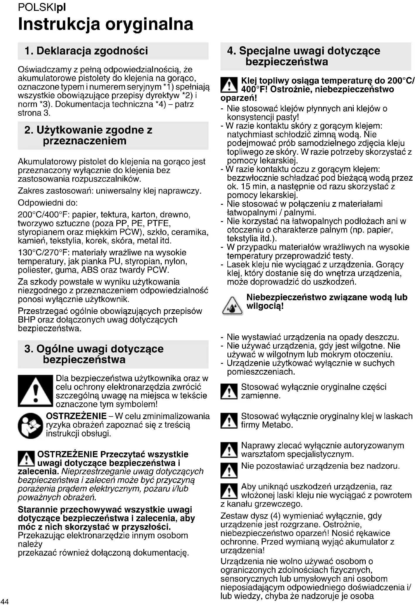 Instrukcja oryginalna Oświadczamy z pełną odpowiedzialnością, że akumulatorowe pistolety do klejenia na gorąco, oznaczone typem i numerem seryjnym *1) spełniają wszystkie obowiązujące przepisy dyrektyw *2) i norm *3). Dokumentacja techniczna *4) – patrz strona 3. Akumulatorowy pistolet do klejenia na gorąco jest przeznaczony wyłącznie do klejenia bez zastosowania rozpuszczalników. Zakres zastosowań: uniwersalny klej naprawczy. Odpowiedni do: 200°C/400°F: papier, tektura, karton, drewno, tworzywo sztuczne (poza PP, PE, PTFE, styropianem oraz miękkim PCW), szkło, ceramika, kamień, tekstylia, korek, skóra, metal itd. 130°C/270°F: materiały wrażliwe na wysokie temperatury, jak pianka PU, styropian, nylon, poliester, guma, ABS oraz twardy PCW. Za szkody powstałe w wyniku użytkowania niezgodnego z przeznaczeniem odpowiedzialność ponosi wyłącznie użytkownik. Przestrzegać ogólnie obowiązujących przepisów BHP oraz dołączonych uwag dotyczących bezpieczeństwa. Dla bezpieczeństwa użytkownika oraz w celu ochrony elektronarzędzia zwrócić szczególną uwagę na miejsca w tekście oznaczone tym symbolem! OSTRZEŻENIE – W celu zminimalizowania ryzyka obrażeń zapoznać się z treścią instrukcji obsługi. OSTRZEŻENIE Przeczytać wszystkie uwagi dotyczące bezpieczeństwa i zalecenia. Nieprzestrzeganie uwag dotyczących bezpieczeństwa i zaleceń może być przyczyną porażenia prądem elektrycznym, pożaru i/lub poważnych obrażeń. Starannie przechowywać wszystkie uwagi dotyczące bezpieczeństwa i zalecenia, aby móc z nich skorzystać w przyszłości. Przekazując elektronarzędzie innym osobom należy przekazać również dołączoną dokumentację. Klej topliwy osiąga temperaturę do 200°C/ 400°F! Ostroż nie, niebezpieczeństwo oparzeń! - Nie stosować klejów płynnych ani klejów o konsystencji pasty! - W razie kontaktu skóry z gorącym klejem: natychmiast schłodzić zimną wodą. Nie podejmować prób samodzielnego zdjęcia kleju topliwego ze skóry. W razie potrzeby skorzystać z pomocy lekarskiej. - W razie kontaktu oczu z gorącym klejem: bezzwłocznie schładzać pod bieżącą wodą przez ok. 15 min, a następnie od razu skorzystać z pomocy lekarskiej. - Nie stosować w połączeniu z materiałami łatwopalnymi / palnymi. -Nie korzystać na łatwopalnych podłożach ani w otoczeniu o charakterze palnym (np. papier, tekstylia itd.). -W przypadku materiałów wrażliwych na wysokie temperatury przeprowadzić testy. - Lasek kleju nie wyciągać z urządzenia. Gorący klej, który dostanie się do wnętrza urządzenia, moż e doprowadzić do uszkodzeń. Niebezpieczeństwo związane wodą lub wilgocią! -Nie wystawiać urządzenia na opady deszczu. -Nie używać urządzenia, gdy jest wilgotne. Nie używać w wilgotnym lub mokrym otoczeniu. -Urządzenie użytkować wyłącznie w suchych pomieszczeniach. Stosować wyłącznie oryginalne części zamienne. Stosować wyłącznie oryginalny klej w laskach firmy Metabo. Naprawy zlecać wyłącznie autoryzowanym warsztatom specjalistycznym. Nie pozostawiać urządzenia bez nadzoru. Aby uniknąć uszkodzeń urządzenia, raz włożonej laski kleju nie wyciągać z powrotem z kanału grzewczego. Zestaw dysz (4) wymieniać wyłącznie, gdy urządzenie jest rozgrzane. Ostrożnie, niebezpieczeństwo oparzeń! Nosi ć rękawice ochronne. Przed wymianą wyjąć akumulator z urządzenia! Urządzenia nie wolno używać osobom o ograniczonych zdolnościach fizycznych, sensorycznych lub umysłowych ani osobom nieposiadającym odpowiedniego doświadczenia i/ lub wiedzy, chyba że nadzoruje je osoba
