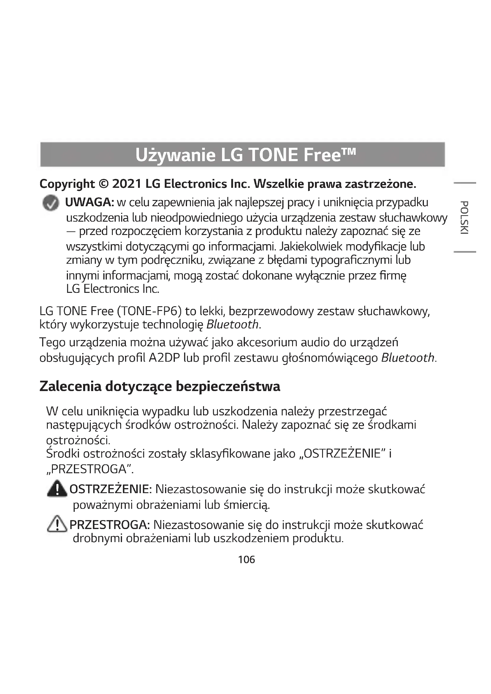 Copyright © 2021 LG Electronics Inc. Wszelkie prawa zastrzeżone. UWAGA: w celu zapewnienia jak najlepszej pracy i uniknięcia przypadku uszkodzenia lub nieodpowiedniego użycia urządzenia zestaw słuchawkowy — przed rozpoczęciem korzystania z produktu należy zapoznać się ze wszystkimi dotyczącymi go informacjami. Jakiekolwiek modykacje lub zmiany w tym podręczniku, związane z błędami typogracznymi lub innymi informacjami, mogą zostać dokonane wyłącznie przez rmę LG Electronics Inc. LG TONE Free (TONE-FP6) to lekki, bezprzewodowy zestaw słuchawkowy, który wykorzystuje technologię Bluetooth. Tego urządzenia można używać jako akcesorium audio do urządzeń obsługujących prol A2DP lub prol zestawu głośnomówiącego Bluetooth. Zalecenia dotyczące bezpieczeństwa W celu uniknięcia wypadku lub uszkodzenia należy przestrzegać następujących środków ostrożności. Należy zapoznać się ze środkami ostrożności. Środki ostrożności zostały sklasykowane jako „OSTRZEŻENIE” i „PRZESTROGA”.