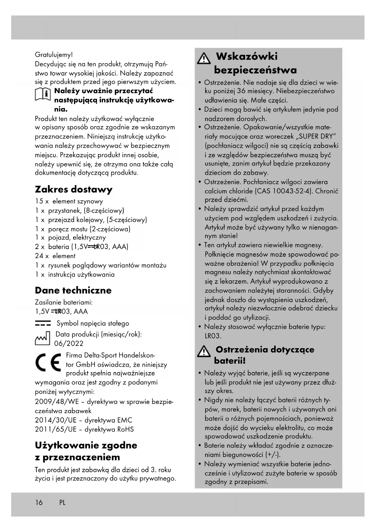 Symbol napięcia stałego Data produkcji (miesiąc/rok): 06/2022 Firma Delta-Sport Handelskon- tor GmbH oświadcza, że niniejszy produkt spełnia najważniejsze wymagania oraz jest zgodny z podanymi poniżej wytycznymi: 2009/48/WE – dyrektywa w sprawie bezpie- czeństwa zabawek 2014/30/UE – dyrektywa EMC 2011/65/UE – dyrektywa RoHS Użytkowanie zgodne z przeznaczeniem Ten produkt jest zabawką dla dzieci od 3. roku życia i jest przeznaczony do użytku prywatnego. Wskazówki bezpieczeństwa