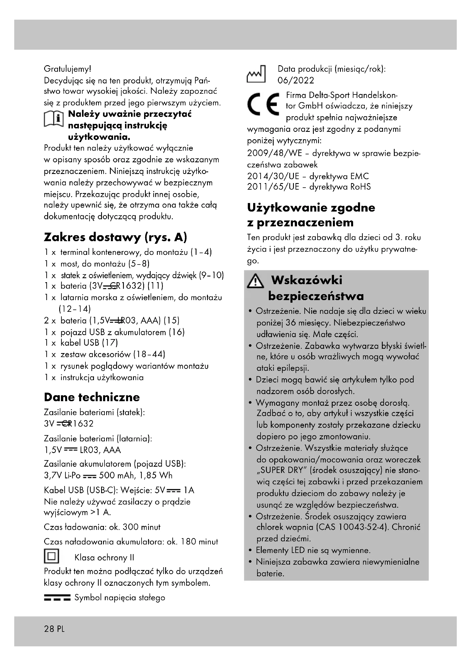 Nie należy używać zasilaczy o prądzie wyjściowym >1 A. Czas ładowania: ok. 300 minut Czas naładowania akumulatora: ok. 180 minut Klasa ochrony II Produkt ten można podłączać tylko do urządzeń klasy ochrony II oznaczonych tym symbolem. Symbol napięcia stałego Data produkcji (miesiąc/rok): 06/2022 Firma Delta-Sport Handelskon- tor GmbH oświadcza, że niniejszy produkt spełnia najważniejsze wymagania oraz jest zgodny z podanymi poniżej wytycznymi: 2009/48/WE – dyrektywa w sprawie bezpie- czeństwa zabawek 2014/30/UE – dyrektywa EMC 2011/65/UE – dyrektywa RoHS Użytkowanie zgodne z przeznaczeniem Ten produkt jest zabawką dla dzieci od 3. roku życia i jest przeznaczony do użytku prywatne- go. Wskazówki bezpieczeństwa