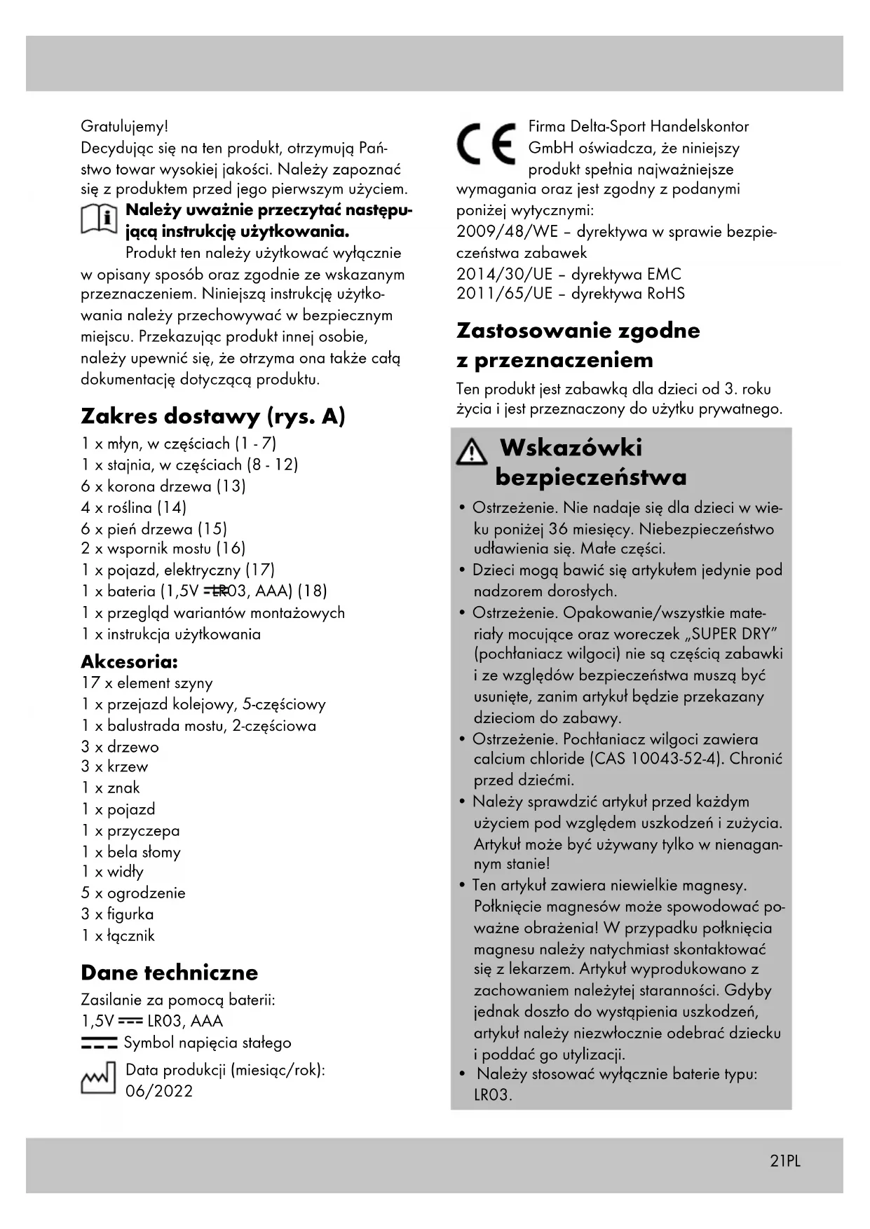 - Ponownie nacisnąć przycisk (17d), aby dez- aktywować pojazd elektryczny. Przechowywanie, czyszczenie Podczas nieużywania należy zawsze przecho- wywać produkt w suchym i czystym miejscu, z wyjętymi bateriami, w temperaturze pokojowej. Czyścić wyłącznie przy użyciu wilgotnej ście- reczki, następnie wytrzeć do sucha. Uwaga: przed pierwszym użyciem szyny należy przeczyścić! WAŻNE! Nie czyścić przy użyciu ostrych środ- ków czyszczących. Uwagi odnośnie recyklingu Jeśli produkt jest zużyty, nie należy go wyrzucać wraz z odpadami domowymi ze względu na ochronę środowiska, ale należy go odpowiednio zutylizować. Informacje o punktach zbiórki i godzinach otwarcia można uzyskać w lokalnej administra- cji. Uszkodzone lub zużyte baterie/akumulatory należy poddać recyklingowi zgodnie z dyrekty- wą 2006/66/WE i jej zmianami. Zwrócić baterie/akumulatory i/lub produkt, korzystając z udostępnionych urządzeń przeznaczonych do zbiórki. Opakowania, takie jak torby plastikowe, nie powinny znaleźć się w rękach dzieci. Opakowanie przechowywać w miejscu niedostępnym dla dzieci. Nieprawidłowa utylizacja baterii/akumulatorów wyrządza szkody w środowisku naturalnym! Baterii/akumulatorów nie wolno wyrzucać razem z odpadami domowymi. Mogą zawierać toksyczne metale ciężkie i podlegają obróbce odpadów niebezpiecznych. Symbole chemiczne metali ciężkich są następujące: Cd = kadm, Hg = rtęć, Pb = ołów. Zużyte baterie/akumulato- ry należy oddawać w miejskim punkcie zbiórki. Produkt oraz opakowanie należy utylizować w sposób przyjazny dla środowiska. Przestrzegać oznakowania materiałów opakowaniowych podczas segregacji odpadów. Są one oznaczone skrótami (a) i liczbami (b) o następującym znaczeniu: 1–7: tworzywa sztuczne/20–22: papier i karton/80–98: materiały kompozytowe. Produkt i materiały opakowaniowe nadają się do recyklingu, należy je osobno zutylizować w celu lepszego przetwarzania odpadów. Logo Triman obowiązuje tylko we Francji. Informacje o sposobie utylizacji zużytego produktu są dostępne u władz lokalnych lub miejskich. Wskazówki dotyczące gwa- rancji i obsługi serwisowej Artykuł został wyprodukowany z najwyższą starannością i pod stałą kontrolą. DELTA-SPORT HANDELSKONTOR GmbH przyznaje klien- towi końcowemu na niniejszy artykuł trzy lata gwarancji od daty zakupu (okres gwarancyjny) z zastrzeżeniem poniższych postanowień. Gwa- rancja dotyczy wyłącznie wad materiałowych i wad wykonania. Gwarancja nie obejmuje części, które podlegają normalnemu zużyciu i z tego względu należy je traktować jako części zużywalne (np. baterie) i nie obejmuje części kruchych, np. przełączników, akumulatorów ani części wykonanych ze szkła. Wyklucza się roszczenia z tytułu niniejszej gwa- rancji w przypadku użycia artykułu w sposób niewłaściwy lub sprzeczny z jego przeznacze- niem lub w sposób wykraczający poza przewi- dziane przeznaczenie lub poza przewidziany zakres użytkowania lub jeśli wytyczne zawarte w instrukcji obsługi nie były przestrzegane, chyba że klient końcowy udowodni istnienie wady materiałowej lub wady wykonania, która nie wynika z podanych wyżej przyczyn. Roszczenia z tytułu gwarancji można zgłaszać wyłącznie w okresie gwarancyjnym za okaza- niem oryginalnego dowodu zakupu. Prosimy zatem zachować oryginalny dowód zakupu! W przypadku jakichkolwiek reklamacji prosimy skontaktować się z nami najpierw za pośrednic- twem podanej poniżej infolinii serwisowej lub drogą e-mailową.24 W przypadku objętym gwarancją artykuł zo- stanie – według naszego uznania – bezpłatnie naprawiony, wymieniony lub nastąpi zwrot ceny zakupu. Z gwarancji nie wynikają żadne inne prawa. Niniejsza gwarancja nie ogranicza Państwa ustawowych praw, w szczególności roszczeń gwarancyjnych wobec danego sprzedawcy. W przypadku wymiany części lub całego arty- kułu okres gwarancji przedłuża się o trzy lata zgodnie z art. 581 § 1 kodeksu cywilnego. Po upłynięciu czasu gwarancji powstałe naprawy są płatne. IAN: 391028_2201 Serwis Polska Tel.: 22 397 4996 E-Mail: deltasport@lidl.pl PL25CZ Srdečně blahopřejeme! Svým nákupem jste se rozhodli pro kvalitní výro- bek. Před prvním použitím se prosím seznamte s tímto výrobkem. Pozorně si přečtete následující návod k použití. Používejte tento výrobek pouze tak, jak je popsáno, a pro uvedené účely. Uschovejte si tento návod k použití pro budoucí použití. Pokud výrobek předáte třetí osobě, předejte jí i veške- rou dokumentaci. Rozsah dodávky (obr. A) 1 x mlýn, rozložený (1 - 7) 1 x stáj, rozložená (8 - 12) 6 x koruna stromu (13) 4 x rostlina (14) 6 x kmen stromu (15) 2 x opěra mostu (16) 1 x vozidlo, elektrické (17) 1 x baterie (1,5V LR03, AAA) (18) 1 x přehled variant sestavení 1 x návod k použití Příslušenství: 17 x prvek kolejnic 1 x železniční přejezd, 5dílný 1 x zábradlí mostu, 2dílné 3 x stromek 3 x keř 1 x štít 1 x vozidlo 1 x přívěs 1 x balík slámy 1 x vidle na hnůj 5 x plot 3 x figurka 1 x spojovací kus Technická data Napájení baterie: