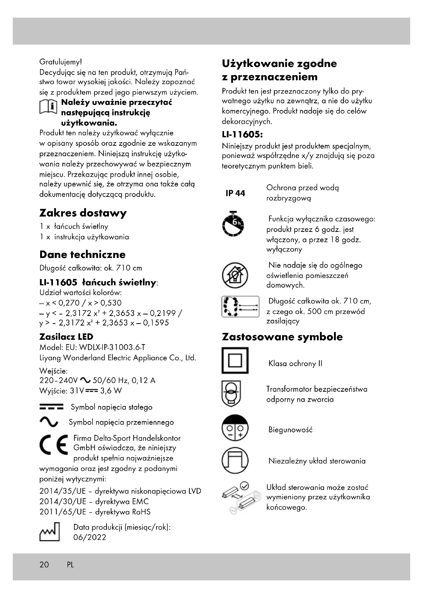 Mogelijkheid van het dimmen van lichtbronnen Het voorschakelapparaat is niet geschikt voor het dimmen van lichtbronnen Buitenafmetingen van het voorschakelapparaat Model: EU: WDLX-IP-31003.6-T – 102 x 41 x 41 mm Model BS WDLX- 31003.6-T – 106 x 49 x 46 mm Gewicht van het voorschakelapparaat Model: EU: WDLX-IP-31003.6-T: 50 g Model BS WDLX- 31003.6-T: 56 g Voorschakelapparaat van het artikel verwijderen Trek voorschakelapparaat uit stopcontact en koppel het los van het artikel Mogelijkheid van compatibele, dimbare lichtbronnen Het voorschakelapparaat is niet geschikt voor het dimmen van lichtbronnen20 Gratulujemy! Decydując się na ten produkt, otrzymują Pań- stwo towar wysokiej jakości. Należy zapoznać się z produktem przed jego pierwszym użyciem. Należy uważnie przeczytać następującą instrukcję użytkowania. Produkt ten należy użytkować wyłącznie w opisany sposób oraz zgodnie ze wskazanym przeznaczeniem. Niniejszą instrukcję użytko- wania należy przechowywać w bezpiecznym miejscu. Przekazując produkt innej osobie, należy upewnić się, że otrzyma ona także całą dokumentację dotyczącą produktu. Zakres dostawy 1 x łańcuch świetlny 1 x instrukcja użytkowania Dane techniczne Długość całkowita: ok. 710 cm LI-11605 łańcuch świetlny: Udział wartości kolorów: — x < 0,270 / x > 0,530 — y < – 2,3172 x + 2,3653 x — 0,2199 / y > – 2,3172 x + 2,3653 x — 0,1595 Zasilacz LED Model: EU: WDLX-IP-31003.6-T Liyang Wonderland Electric Appliance Co., Ltd. Wejście: 220–240V 50/60 Hz, 0,12 A Wyjście: 31V 3,6 W Symbol napięcia stałego Symbol napięcia przemiennego Firma Delta-Sport Handelskontor GmbH oświadcza, że niniejszy produkt spełnia najważniejsze wymagania oraz jest zgodny z podanymi poniżej wytycznymi: 2014/35/UE – dyrektywa niskonapięciowa LVD 2014/30/UE – dyrektywa EMC 2011/65/UE – dyrektywa RoHS Data produkcji (miesiąc/rok): 06/2022 Użytkowanie zgodne z przeznaczeniem Produkt ten jest przeznaczony tylko do pry- watnego użytku na zewnątrz, a nie do użytku komercyjnego. Produkt nadaje się do celów dekoracyjnych. LI-11605: Niniejszy produkt jest produktem specjalnym, ponieważ współrzędne x/y znajdują się poza teoretycznym punktem bieli. IP 44 Ochrona przed wodą rozbryzgową Funkcja wyłącznika czasowego: produkt przez 6 godz. jest włączony, a przez 18 godz. wyłączony Nie nadaje się do ogólnego oświetlenia pomieszczeń domowych. Długość całkowita ok. 710 cm, z czego ok. 500 cm przewód zasilający Zastosowane symbole Klasa ochrony II Transformator bezpieczeństwa odporny na zwarcia Biegunowość Niezależny układ sterowania Układ sterowania może zostać wymieniony przez użytkownika końcowego. PL21PL Wskazówki bezpieczeństwa Ważne: należy uważnie przeczytać ni- niejszą instrukcję użytkowania i zacho- wać ją do późniejszego użytku! Zagrożenie życia!