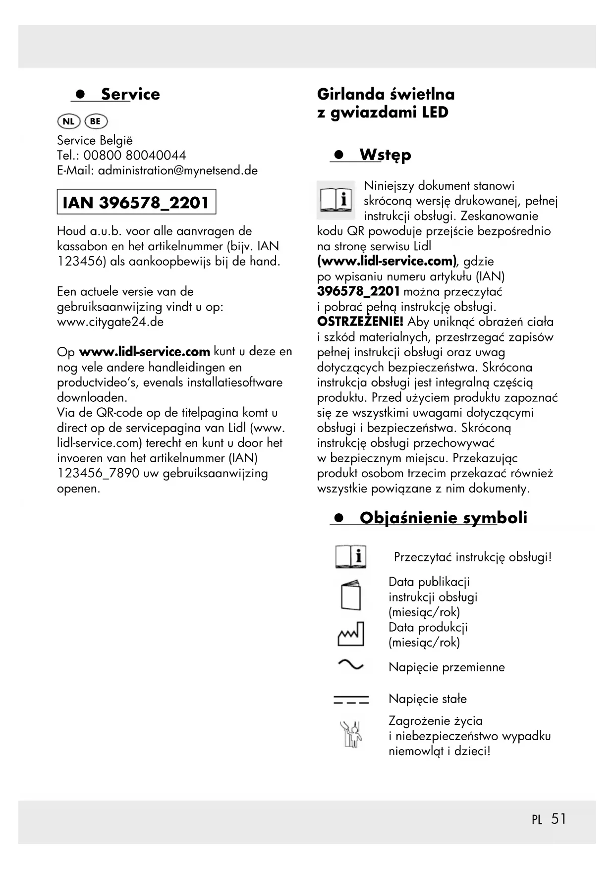 www.lidl-service.com kunt u deze en nog vele andere handleidingen en productvideo‘s, evenals installatiesoftware downloaden. Via de QR-code op de titelpagina komt u direct op de servicepagina van Lidl (www. lidl-service.com) terecht en kunt u door het invoeren van het artikelnummer (IAN) 123456_7890 uw gebruiksaanwijzing openen. Girlanda świetlna z gwiazdami LED z Wstęp Niniejszy dokument stanowi skróconą wersję drukowanej, pełnej instrukcji obsługi. Zeskanowanie kodu QR powoduje przejście bezpośrednio na stronę serwisu Lidl (www.lidl-service.com) , gdzie po wpisaniu numeru artykułu (IAN) 396578_2201 można przeczytać i pobrać pełną instrukcję obsługi. OSTRZEŻENIE! Aby uniknąć obrażeń ciała i szkód materialnych, przestrzegać zapisów pełnej instrukcji obsługi oraz uwag dotyczących bezpieczeństwa. Skrócona instrukcja obsługi jest integralną częścią produktu. Przed użyciem produktu zapoznać się ze wszystkimi uwagami dotyczącymi obsługi i bezpieczeństwa. Skróconą instrukcję obsługi przechowywać w bezpiecznym miejscu. Przekazując produkt osobom trzecim przekazać również wszystkie powiązane z nim dokumenty. z Objaśnienie symboli Przeczytać instrukcję obsługi! Data publikacji instrukcji obsługi (miesiąc/rok) Data produkcji (miesiąc/rok) Napięcie przemienne Napięcie stałe Zagrożenie życia i niebezpieczeństwo wypadku niemowląt i dzieci!52