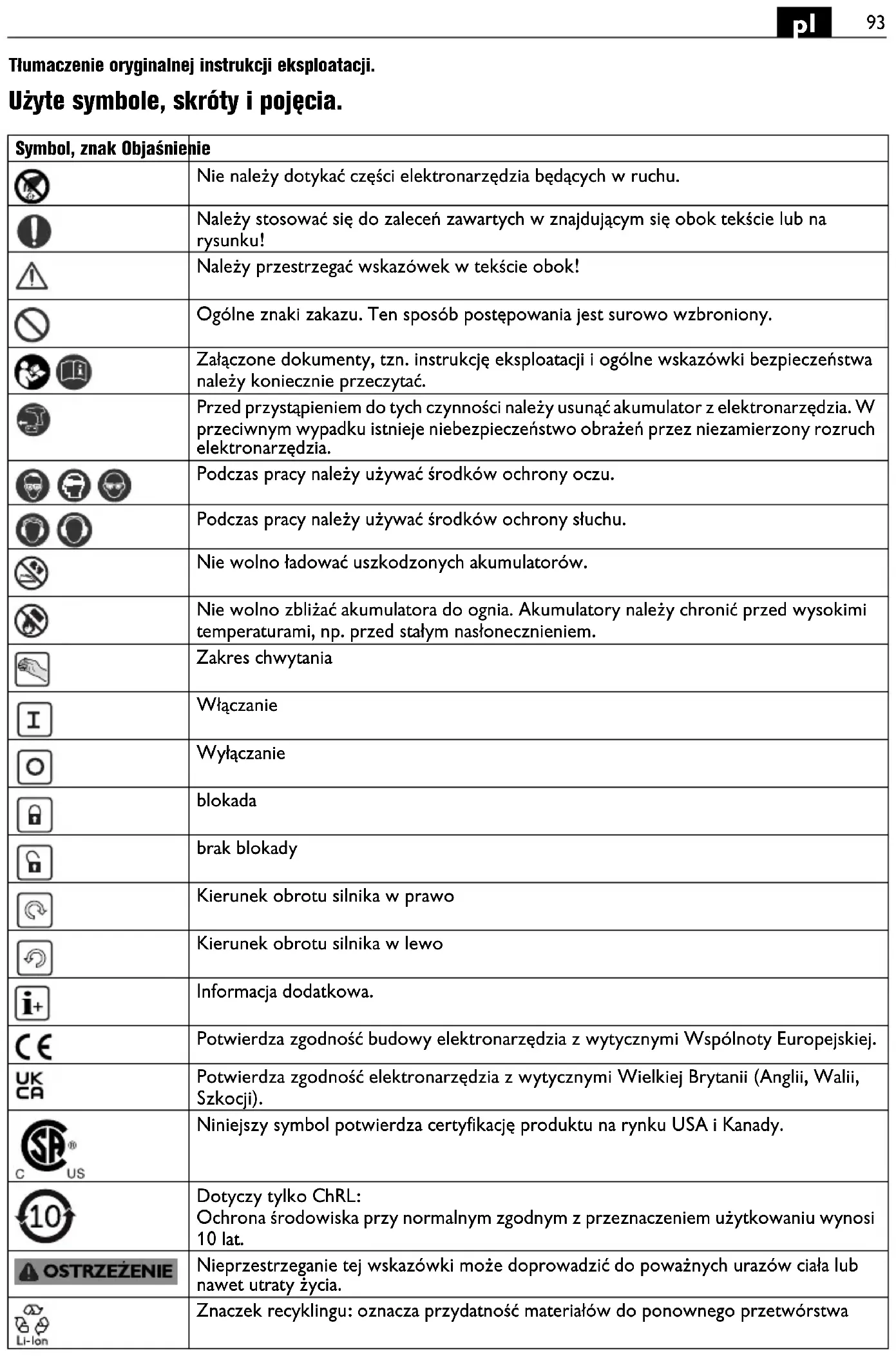 Tłumaczenie oryginalnej instrukcji eksploatacji. Użyte symbole, skróty i pojęcia. Symbol, znak Objaśnienie Nie należy dotykać części elektronarzędzia będących w ruchu. Należy stosować się do zaleceń zawartych w znajdującym się obok tekście lub na rysunku! Należy przestrzegać wskazówek w tekście obok! Ogólne znaki zakazu. Ten sposób postępowania jest surowo wzbroniony. Załączone dokumenty, tzn. instrukcję eksploatacji i ogólne wskazówki bezpieczeństwa należy koniecznie przeczytać. Przed przystąpieniem do tych czynności należy usunąć akumulator z elektronarzędzia. W przeciwnym wypadku istnieje niebezpieczeństwo obrażeń przez niezamierzony rozruch elektronarzędzia. Podczas pracy należy używać środków ochrony oczu. Podczas pracy należy używać środków ochrony słuchu. Nie wolno ładować uszkodzonych akumulatorów. Nie wolno zbliżać akumulatora do ognia. Akumulatory należy chronić przed wysokimi temperaturami, np. przed stałym nasłonecznieniem. Zakres chwytania Włączanie Wyłączanie blokada brak blokady Kierunek obrotu silnika w prawo Kierunek obrotu silnika w lewo Informacja dodatkowa. Potwierdza zgodność budowy elektronarzędzia z wytycznymi Wspólnoty Europejskiej. Potwierdza zgodność elektronarzędzia z wytycznymi Wielkiej Brytanii (Anglii, Walii, Szkocji). Niniejszy symbol potwierdza certyfikację produktu na rynku USA i Kanady. Dotyczy tylko ChRL: Ochrona środowiska przy normalnym zgodnym z przeznaczeniem użytkowaniu wynosi 10 lat. Nieprzestrzeganie tej wskazówki może doprowadzić do poważnych urazów ciała lub nawet utraty życia. Znaczek recyklingu: oznacza przydatność materiałów do ponownego przetwórstwa94