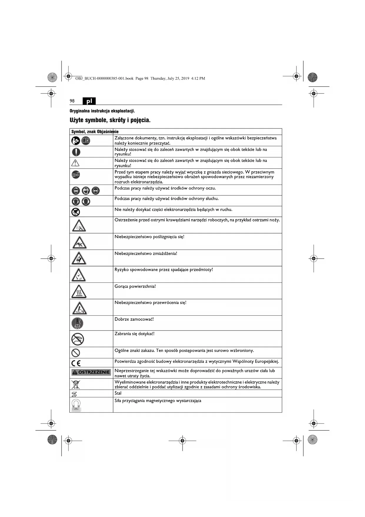 Oryginalna instrukcja eksploatacji. Użyte symbole, skróty i pojęcia. Symbol, znak Objaśnienie Załączone dokumenty, tzn. instrukcję eksploatacji i ogólne wskazówki bezpieczeństwa należy koniecznie przeczytać. Należy stosować się do zaleceń zawartych w znajdującym się obok tekście lub na rysunku! Należy stosować się do zaleceń zawartych w znajdującym się obok tekście lub na rysunku! Przed tym etapem pracy należy wyjąć wtyczkę z gniazda sieciowego. W przeciwnym wypadku istnieje niebezpieczeństwo obrażeń spowodowanych przez niezamierzony rozruch elektronarzędzia. Podczas pracy należy używać środków ochrony oczu. Podczas pracy należy używać środków ochrony słuchu. Nie należy dotykać części elektronarzędzia będących w ruchu. Ostrzeżenie przed ostrymi krawędziami narzędzi roboczych, na przykład ostrzami noży. Niebezpieczeństwo poślizgnięcia się! Niebezpieczeństwo zmiażdżenia! Ryzyko spowodowane przez spadające przedmioty! Gorąca powierzchnia! Niebezpieczeństwo przewrócenia się! Dobrze zamocować! Zabrania się dotykać! Ogólne znaki zakazu. Ten sposób postępowania jest surowo wzbroniony. Potwierdza zgodność budowy elektronarzędzia z wytycznymi Wspólnoty Europejskiej. Nieprzestrzeganie tej wskazówki może doprowadzić do poważnych urazów ciała lub nawet utraty życia. Wyeliminowane elektronarzędzia i inne produkty elektrotechniczne i elektryczne należy zbierać oddzielnie i poddać utylizacji zgodnie z zasadami ochrony środowiska. Stal Siła przyciągania magnetycznego wystarczająca OBJ_BUCH-0000000385-001.book Page 98 Thursday, July 25, 2019 4:12 PM99