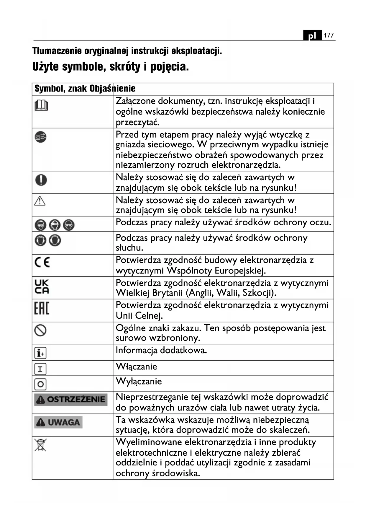 Tłumaczenie oryginalnej instrukcji eksploatacji. Użyte symbole, skróty i pojęcia. Symbol, znak Objaśnienie Załączone dokumenty, tzn. instrukcję eksploatacji i ogólne wskazówki bezpieczeństwa należy koniecznie przeczytać. Przed tym etapem pracy należy wyjąć wtyczkę z gniazda sieciowego. W przeciwnym wypadku istnieje niebezpieczeństwo obrażeń spowodowanych przez niezamierzony rozruch elektronarzędzia. Należy stosować się do zaleceń zawartych w znajdującym się obok tekście lub na rysunku! Należy stosować się do zaleceń zawartych w znajdującym się obok tekście lub na rysunku! Podczas pracy należy używać środków ochrony oczu. Podczas pracy należy używać środków ochrony słuchu. Potwierdza zgodność budowy elektronarzędzia z wytycznymi Wspólnoty Europejskiej. Potwierdza zgodność elektronarzędzia z wytycznymi Wielkiej Brytanii (Anglii, Walii, Szkocji). Potwierdza zgodność elektronarzędzia z wytycznymi Unii Celnej. Ogólne znaki zakazu. Ten sposób postępowania jest surowo wzbroniony. Informacja dodatkowa. Włączanie Wyłączanie Nieprzestrzeganie tej wskazówki może doprowadzić do poważnych urazów ciała lub nawet utraty życia. Ta wskazówka wskazuje możliwą niebezpieczną sytuację, która doprowadzić może do skaleczeń. Wyeliminowane elektronarzędzia i inne produkty elektrotechniczne i elektryczne należy zbierać oddzielnie i poddać utylizacji zgodnie z zasadami ochrony środowiska.178