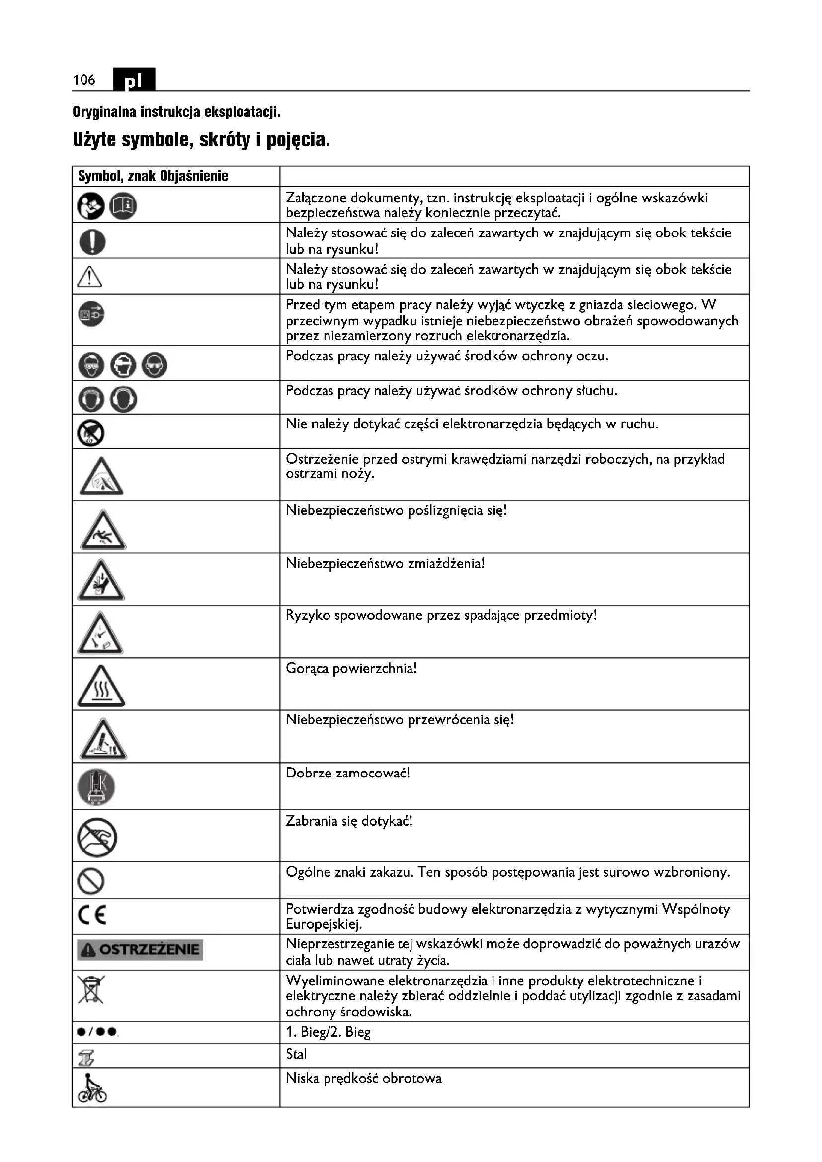 Oryginalna instrukcja eksploatacji. Użyte symbole, skróty i pojęcia. Symbol, znak Objaśnienie Załączone dokumenty, tzn. instrukcję eksploatacji i ogólne wskazówki bezpieczeństwa należy koniecznie przeczytać. Należy stosować się do zaleceń zawartych w znajdującym się obok tekście lub na rysunku! Należy stosować się do zaleceń zawartych w znajdującym się obok tekście lub na rysunku! Przed tym etapem pracy należy wyjąć wtyczkę z gniazda sieciowego. W przeciwnym wypadku istnieje niebezpieczeństwo obrażeń spowodowanych przez niezamierzony rozruch elektronarzędzia. Podczas pracy należy używać środków ochrony oczu. Podczas pracy należy używać środków ochrony słuchu. Nie należy dotykać części elektronarzędzia będących w ruchu. Ostrzeżenie przed ostrymi krawędziami narzędzi roboczych, na przykład ostrzami noży. Niebezpieczeństwo poślizgnięcia się! Niebezpieczeństwo zmiażdżenia! Ryzyko spowodowane przez spadające przedmioty! Gorąca powierzchnia! Niebezpieczeństwo przewrócenia się! Dobrze zamocować! Zabrania się dotykać! Ogólne znaki zakazu. Ten sposób postępowania jest surowo wzbroniony. Potwierdza zgodność budowy elektronarzędzia z wytycznymi Wspólnoty Europejskiej. Nieprzestrzeganie tej wskazówki może doprowadzić do poważnych urazów ciała lub nawet utraty życia. Wyeliminowane elektronarzędzia i inne produkty elektrotechniczne i elektryczne należy zbierać oddzielnie i poddać utylizacji zgodnie z zasadami ochrony środowiska.