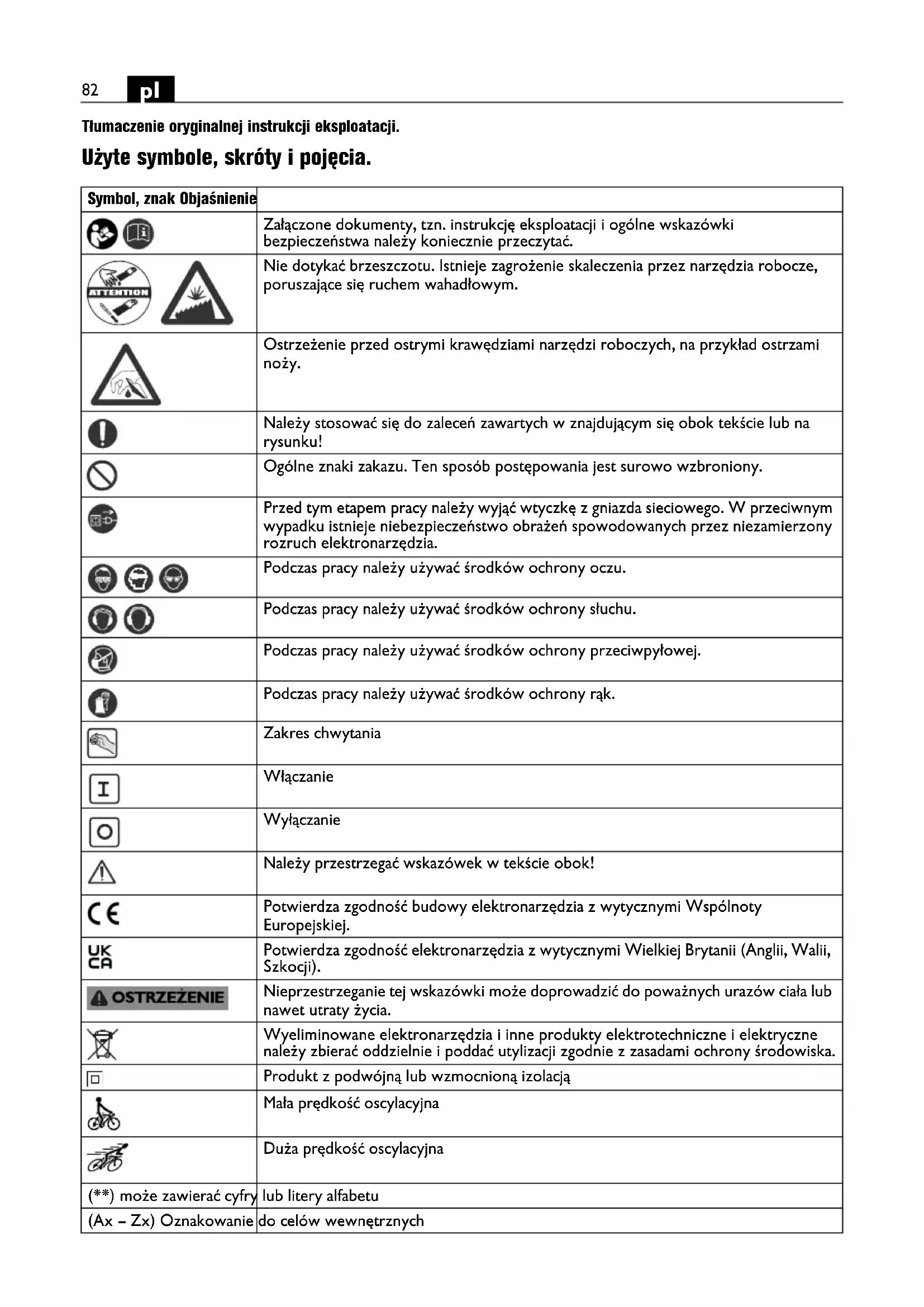 Tłumaczenie oryginalnej instrukcji eksploatacji. Użyte symbole, skróty i pojęcia. Symbol, znak Objaśnienie Załączone dokumenty, tzn. instrukcję eksploatacji i ogólne wskazówki bezpieczeństwa należy koniecznie przeczytać. Nie dotykać brzeszczotu. Istnieje zagrożenie skaleczenia przez narzędzia robocze, poruszające się ruchem wahadłowym. Ostrzeżenie przed ostrymi krawędziami narzędzi roboczych, na przykład ostrzami noży. Należy stosować się do zaleceń zawartych w znajdującym się obok tekście lub na rysunku! Ogólne znaki zakazu. Ten sposób postępowania jest surowo wzbroniony. Przed tym etapem pracy należy wyjąć wtyczkę z gniazda sieciowego. W przeciwnym wypadku istnieje niebezpieczeństwo obrażeń spowodowanych przez niezamierzony rozruch elektronarzędzia. Podczas pracy należy używać środków ochrony oczu. Podczas pracy należy używać środków ochrony słuchu. Podczas pracy należy używać środków ochrony przeciwpyłowej. Podczas pracy należy używać środków ochrony rąk. Zakres chwytania Włączanie Wyłączanie Należy przestrzegać wskazówek w tekście obok! Potwierdza zgodność budowy elektronarzędzia z wytycznymi Wspólnoty Europejskiej. Potwierdza zgodność elektronarzędzia z wytycznymi Wielkiej Brytanii (Anglii, Walii, Szkocji). Nieprzestrzeganie tej wskazówki może doprowadzić do poważnych urazów ciała lub nawet utraty życia. Wyeliminowane elektronarzędzia i inne produkty elektrotechniczne i elektryczne należy zbierać oddzielnie i poddać utylizacji zgodnie z zasadami ochrony środowiska. Produkt z podwójną lub wzmocnioną izolacją Mała prędkość oscylacyjna Duża prędkość oscylacyjna (**) może zawierać cyfry lub litery alfabetu (Ax – Zx) Oznakowanie do celów wewnętrznych83