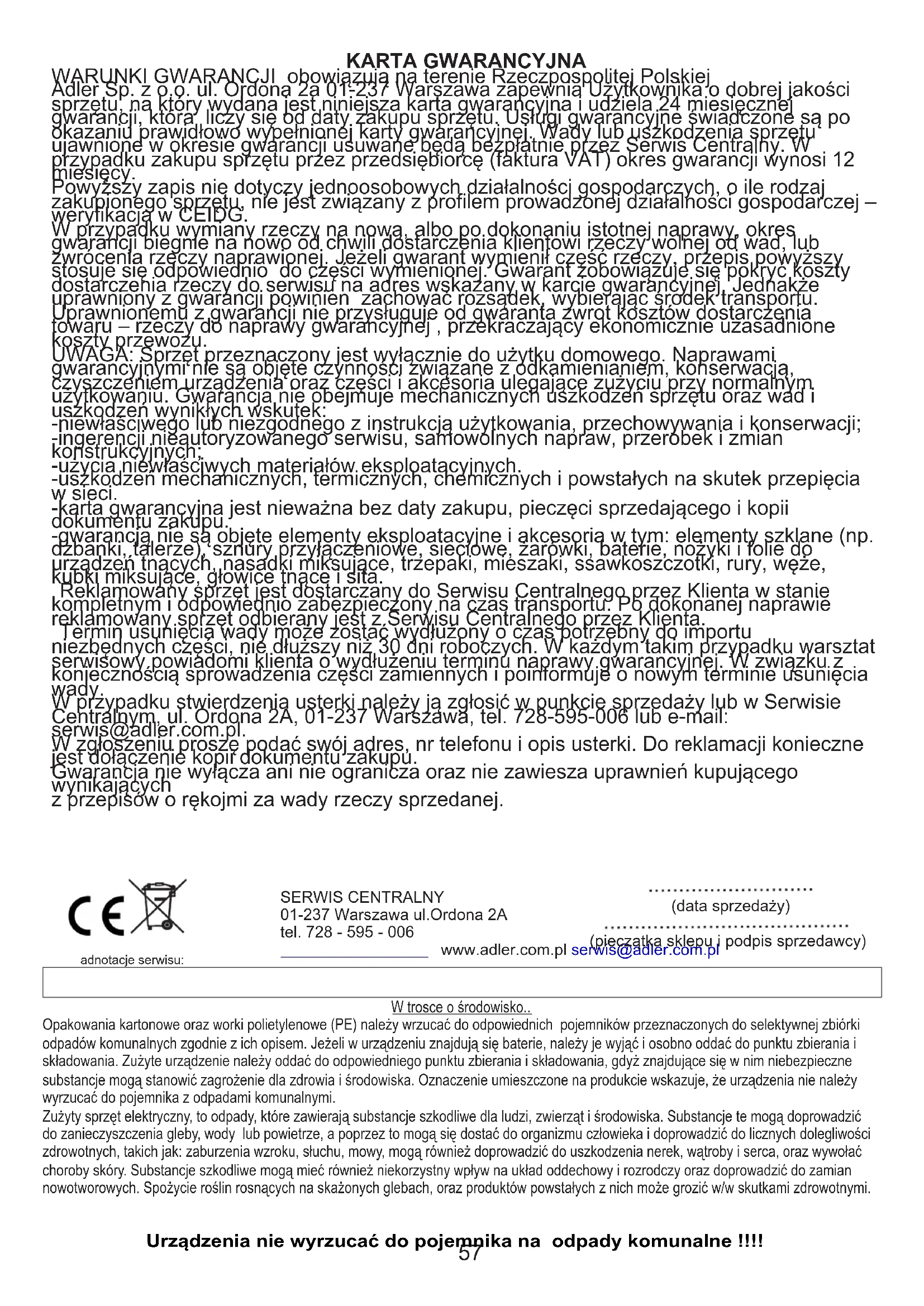 Технически данни: Тип батерия: 3x AAA (Lr04) Препоръчваме да използвате акумулаторни батерии. USB захранване: 5V 1A Температурен диапазон: 0-50 ℃ За да защитите околната си среда: моля, отделете картонените кутии и найлоновите торбички и ги изхвърлете в съответните кошчета за отпадъци. Използваният уред трябва да бъде доставен до специалните пунктове за събиране, които могат да повлияят на околната среда. Не изхвърляйте този уред в обикновен кош за отпадъци.57 KARTA GWARANCYJNA WARUNKI GWARANCJI obowiązują na terenie Rzeczpospolitej Polskiej Adler Sp. z o.o. ul. Ordona 2a 01-237 Warszawa zapewnia Użytkownika o dobrej jakości sprzętu, na który wydana jest niniejsza karta gwarancyjna i udziela 24 miesięcznej gwarancji, która liczy się od daty zakupu sprzętu. Usługi gwarancyjne świadczone są po okazaniu prawidłowo wypełnionej karty gwarancyjnej. Wady lub uszkodzenia sprzętu ujawnione w okresie gwarancji usuwane będą bezpłatnie przez Serwis Centralny. W przypadku zakupu sprzętu przez przedsiębiorcę (faktura VAT) okres gwarancji wynosi 12 miesięcy. Powyższy zapis nie dotyczy jednoosobowych działalności gospodarczych, o ile rodzaj zakupionego sprzętu, nie jest związany z profilem prowadzonej działalności gospodarczej – weryfikacja w CEIDG. W przypadku wymiany rzeczy na nową, albo po dokonaniu istotnej naprawy, okres gwarancji biegnie na nowo od chwili dostarczenia klientowi rzeczy wolnej od wad, lub zwrócenia rzeczy naprawionej. Jeżeli gwarant wymienił część rzeczy, przepis powyższy stosuje się odpowiednio do części wymienionej. Gwarant zobowiązuje się pokryć koszty dostarczenia rzeczy do serwisu na adres wskazany w karcie gwarancyjnej. Jednakże uprawniony z gwarancji powinien zachować rozsądek, wybierając środek transportu. Uprawnionemu z gwarancji nie przysługuje od gwaranta zwrot kosztów dostarczenia towaru – rzeczy do naprawy gwarancyjnej , przekraczający ekonomicznie uzasadnione koszty przewozu. UWAGA: Sprzęt przeznaczony jest wyłącznie do użytku domowego. Naprawami gwarancyjnymi nie są objęte czynności związane z odkamienianiem, konserwacją, czyszczeniem urządzenia oraz części i akcesoria ulegające zużyciu przy normalnym użytkowaniu. Gwarancja nie obejmuje mechanicznych uszkodzeń sprzętu oraz wad i uszkodzeń wynikłych wskutek: -niewłaściwego lub niezgodnego z instrukcją użytkowania, przechowywania i konserwacji; -ingerencji nieautoryzowanego serwisu, samowolnych napraw, przeróbek i zmian konstrukcyjnych; -użycia niewłaściwych materiałów eksploatacyjnych. -uszkodzeń mechanicznych, termicznych, chemicznych i powstałych na skutek przepięcia w sieci. -karta gwarancyjna jest nieważna bez daty zakupu, pieczęci sprzedającego i kopii dokumentu zakupu. -gwarancją nie są objęte elementy eksploatacyjne i akcesoria w tym: elementy szklane (np. dzbanki, talerze), sznury przyłączeniowe, sieciowe, żarówki, baterie, nożyki i folie do urządzeń tnących, nasadki miksujące, trzepaki, mieszaki, ssawkoszczotki, rury, węże, kubki miksujące, głowice tnące i sita. Reklamowany sprzęt jest dostarczany do Serwisu Centralnego przez Klienta w stanie kompletnym i odpowiednio zabezpieczony na czas transportu. Po dokonanej naprawie reklamowany sprzęt odbierany jest z Serwisu Centralnego przez Klienta. Termin usunięcia wady może zostać wydłużony o czas potrzebny do importu niezbędnych części, nie dłuższy niż 30 dni roboczych. W każdym takim przypadku warsztat serwisowy powiadomi klienta o wydłużeniu terminu naprawy gwarancyjnej. W związku z koniecznością sprowadzenia części zamiennych i poinformuje o nowym terminie usunięcia wady. W przypadku stwierdzenia usterki należy ją zgłosić w punkcie sprzedaży lub w Serwisie Centralnym, ul. Ordona 2A, 01-237 Warszawa, tel. 728-595-006 lub e-mail: serwis@adler.com.pl. W zgłoszeniu proszę podać swój adres, nr telefonu i opis usterki. Do reklamacji konieczne jest dołączenie kopii dokumentu zakupu. Gwarancja nie wyłącza ani nie ogranicza oraz nie zawiesza uprawnień kupującego wynikających z przepisów o rękojmi za wady rzeczy sprzedanej. SERWIS CENTRALNY 01-237 Warszawa ul.Ordona 2A tel. 728 - 595 - 006 www.adler.com.pl serwis@adler.com.pl (data sprzedaży) (pieczątka sklepu i podpis sprzedawcy) adnotacje serwisu: Urządzenia nie wyrzucać do pojemnika na odpady komunalne !!!! W trosce o środowisko.. Opakowania kartonowe oraz worki polietylenowe (PE) należy wrzucać do odpowiednich pojemników przeznaczonych do selektywnej zbiórki odpadów komunalnych zgodnie z ich opisem. Jeżeli w urządzeniu znajdują się baterie, należy je wyjąć i osobno oddać do punktu zbierania i składowania. Zużyte urządzenie należy oddać do odpowiedniego punktu zbierania i składowania, gdyż znajdujące się w nim niebezpieczne substancje mogą stanowić zagrożenie dla zdrowia i środowiska. Oznaczenie umieszczone na produkcie wskazuje, że urządzenia nie należy wyrzucać do pojemnika z odpadami komunalnymi. Zużyty sprzęt elektryczny, to odpady, które zawierają substancje szkodliwe dla ludzi, zwierząt i środowiska. Substancje te mogą doprowadzić do zanieczyszczenia gleby, wody lub powietrze, a poprzez to mogą się dostać do organizmu człowieka i doprowadzić do licznych dolegliwości zdrowotnych, takich jak: zaburzenia wzroku, słuchu, mowy, mogą również doprowadzić do uszkodzenia nerek, wątroby i serca, oraz wywołać choroby skóry. Substancje szkodliwe mogą mieć również niekorzystny wpływ na układ oddechowy i rozrodczy oraz doprowadzić do zamian nowotworowych. Spoży