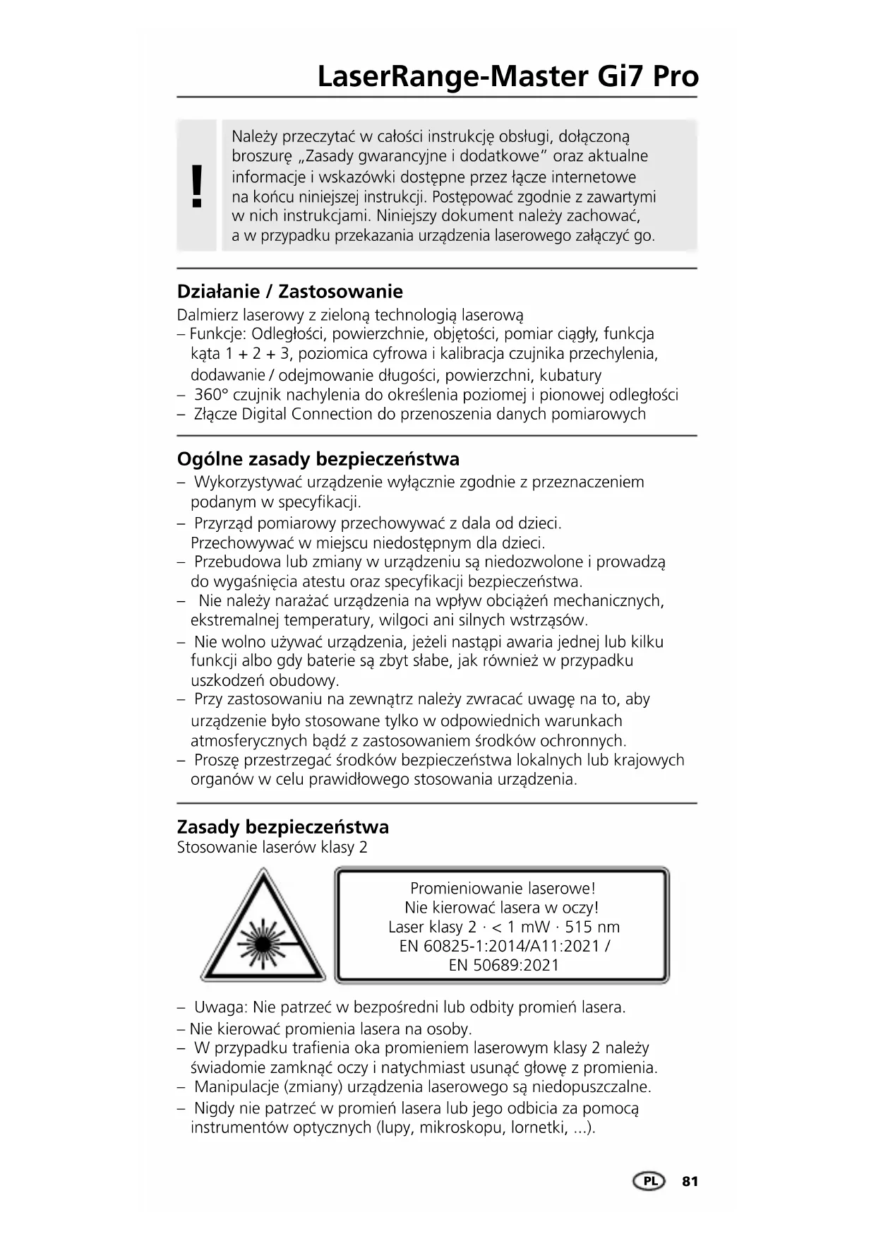 Promieniowanie laserowe! Nie kierować lasera w oczy! Laser klasy 2 · < 1 mW · 515 nm EN 60825-1:2014/A11:2021 / EN 50689:2021 Zasady bezpieczeństwa Stosowanie laserów klasy 2 Ogólne zasady bezpieczeństwa – Wykorzystywać urządzenie wyłącznie zgodnie z przeznaczeniem podanym w specykacji. – Przyrząd pomiarowy przechowywać z dala od dzieci. Przechowywać wmiejscu niedostępnym dla dzieci. – Przebudowa lub zmiany w urządzeniu są niedozwolone i prowadzą do wygaśnięcia atestu oraz specykacji bezpieczeństwa. – Nie należy narażać urządzenia na wpływ obciążeń mechanicznych, ekstremalnej temperatury, wilgoci ani silnych wstrząsów. – Nie wolno używać urządzenia, jeżeli nastąpi awaria jednej lub kilku funkcji albo gdy baterie są zbyt słabe, jak również wprzypadku uszkodzeń obudowy. – Przy zastosowaniu na zewnątrz należy zwracać uwagę na to, aby urządzenie było stosowane tylko w odpowiednich warunkach atmosferycznych bądź z zastosowaniem środków ochronnych. – Proszę przestrzegać środków bezpieczeństwa lokalnych lub krajowych organów w celu prawidłowego stosowania urządzenia. Dalmierz laserowy z zieloną technologią laserową – Funkcje: Odległości, powierzchnie, objętości, pomiar ciągły, funkcja kąta 1 + 2 + 3, poziomica cyfrowa i kalibracja czujnika przechylenia, dodawanie / odejmowanie długości, powierzchni, kubatury – 360° czujnik nachylenia do określenia poziomej i pionowej odległości – Złącze Digital Connection do przenoszenia danych pomiarowych Działanie / Zastosowanie Należy przeczytać wcałości instrukcję obsługi, dołączoną broszurę „Zasady gwarancyjne idodatkowe” oraz aktualne informacje iwskazówki dostępne przez łącze internetowe na końcu niniejszej instrukcji. Postępować zgodnie z zawartymi w nich instrukcjami. Niniejszy dokument należy zachować, a w przypadku przekazania urządzenia laserowego załączyć go.