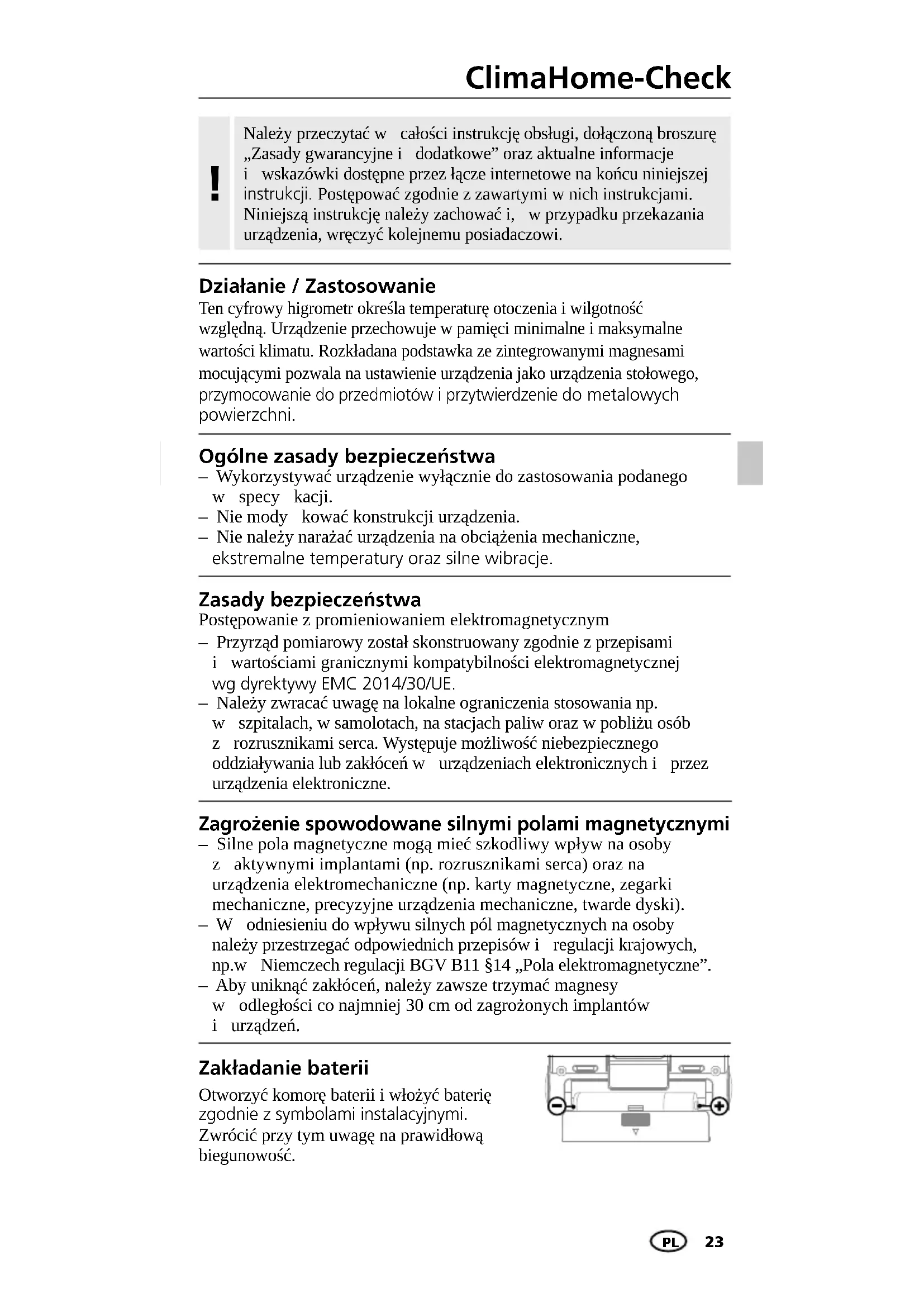 Zagrożenie spowodowane silnymi polami magnetycznymi – Silne pola magnetyczne mogą mieć szkodliwy wpływ na osoby zaktywnymi implantami (np. rozrusznikami serca) oraz na urządzenia elektromechaniczne (np. karty magnetyczne, zegarki mechaniczne, precyzyjne urządzenia mechaniczne, twarde dyski). – Wodniesieniu do wpływu silnych pól magnetycznych na osoby należy przestrzegać odpowiednich przepisów iregulacji krajowych, np.wNiemczech regulacji BGV B11 §14 „Pola elektromagnetyczne”. – Aby uniknąć zakłóceń, należy zawsze trzymać magnesy wodległości co najmniej 30 cm od zagrożonych implantów iurządzeń. Zakładanie baterii Otworzyć komorę baterii i włożyć baterię zgodnie z symbolami instalacyjnymi. Zwrócić przy tym uwagę na prawidłową biegunowość. Zasady bezpieczeństwa Postępowanie z promieniowaniem elektromagnetycznym – Przyrząd pomiarowy został skonstruowany zgodnie z przepisami iwartościami granicznymi kompatybilności elektromagnetycznej wg dyrektywy EMC 2014/30/UE. – Należy zwracać uwagę na lokalne ograniczenia stosowania np. wszpitalach, w samolotach, na stacjach paliw oraz w pobliżu osób zrozrusznikami serca. Występuje możliwość niebezpiecznego oddziaływania lub zakłóceń wurządzeniach elektronicznych iprzez urządzenia elektroniczne. Ogólne zasady bezpieczeństwa – Wykorzystywać urządzenie wyłącznie do zastosowania podanego wspecykacji. – Nie modykować konstrukcji urządzenia. – Nie należy narażać urządzenia na obciążenia mechaniczne, ekstremalne temperatury oraz silne wibracje. Należy przeczytać wcałości instrukcję obsługi, dołączoną broszurę „Zasady gwarancyjne idodatkowe” oraz aktualne informacje iwskazówki dostępne przez łącze internetowe na końcu niniejszej instrukcji. Postępować zgodnie z zawartymi w nich instrukcjami. Niniejszą instrukcję należy zachować i,w przypadku przekazania urządzenia, wręczyć kolejnemu posiadaczowi.