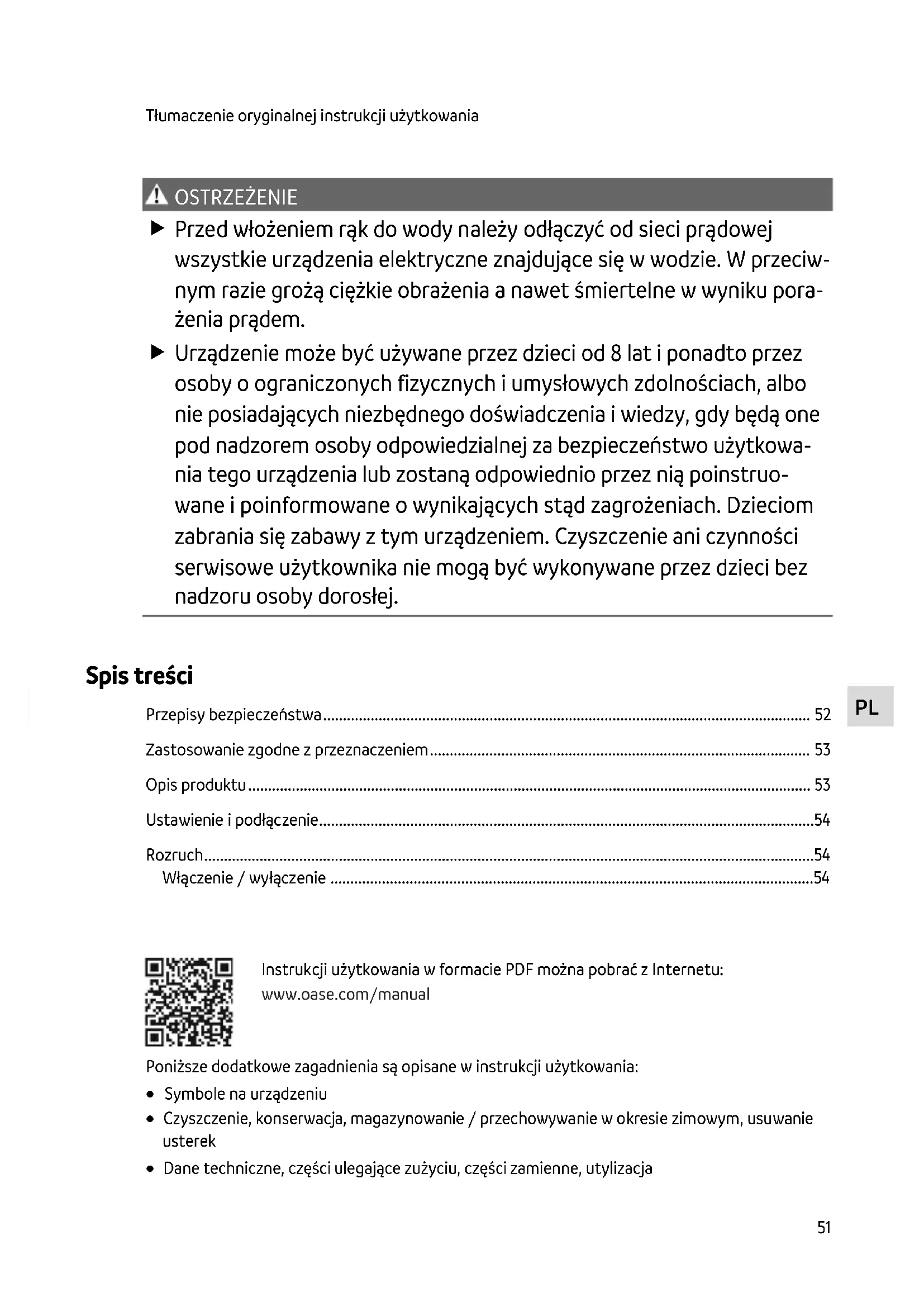 Instrukcji użytkowania w formacie PDF można pobrać z Internetu: www.oase.com/manual Poniższe dodatkowe zagadnienia są opisane w instrukcji użytkowania: