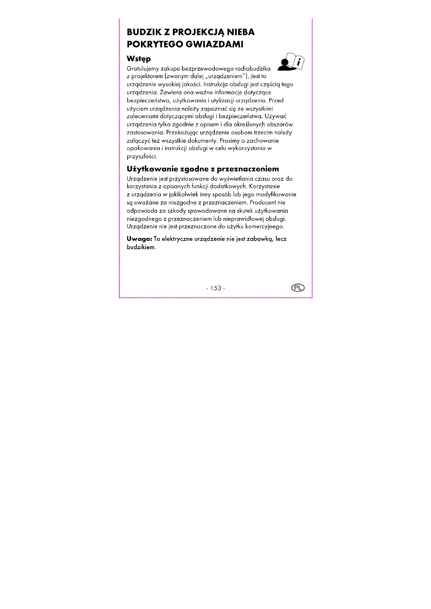 POKRYTEGO GWIAZDAMI Wstęp Gratulujemy zakupu bezprzewodowego radiobudzika z projektorem (zwanym dalej „urządzeniem”). Jest to urządzenie wysokiej jakości. Instrukcja obsługi jest częścią tego urządzenia. Zawiera ona ważne informacje dotyczące bezpieczeństwa, użytkowania i utylizacji urządzenia. Przed użyciem urządzenia należy zapoznać się ze wszystkimi zaleceniami dotyczącymi obsługi i bezpieczeństwa. Używać urządzenia tylko zgodnie z opisem i dla określonych obszarów zastosowania. Przekazując urządzenie osobom trzecim należy załączyć też wszystkie dokumenty. Prosimy o zachowanie opakowania i instrukcji obsługi w celu wykorzystania w przyszłości. Użytkowanie zgodne z przeznaczeniem Urządzenie jest przystosowane do wyświetlania czasu oraz do korzystania z opisanych funkcji dodatkowych. Korzystanie z urządzenia w jakikolwiek inny sposób lub jego modyfikowanie są uważane za niezgodne z przeznaczeniem. Producent nie odpowiada za szkody spowodowane na skutek użytkowania niezgodnego z przeznaczeniem lub nieprawidłowej obsługi. Urządzenie nie jest przeznaczone do użytku komercyjnego. Uwaga: To elektryczne urządzenie nie jest zabawką, lecz budzikiem.- 154 - Zawartość opakowania Wskazówka: Po zakupie prosimy o sprawdzenie zawartości opakowania. Należy upewnić się, że wszystkie części są kompletne i nieuszkodzone. Jeśli zawartość opakowania jest niekompletna lub części są uszkodzone, nie należy go używać. Prosimy o kontakt z serwisem (patrz „Postępowanie w przypadku roszczeń gwarancyjnych”).