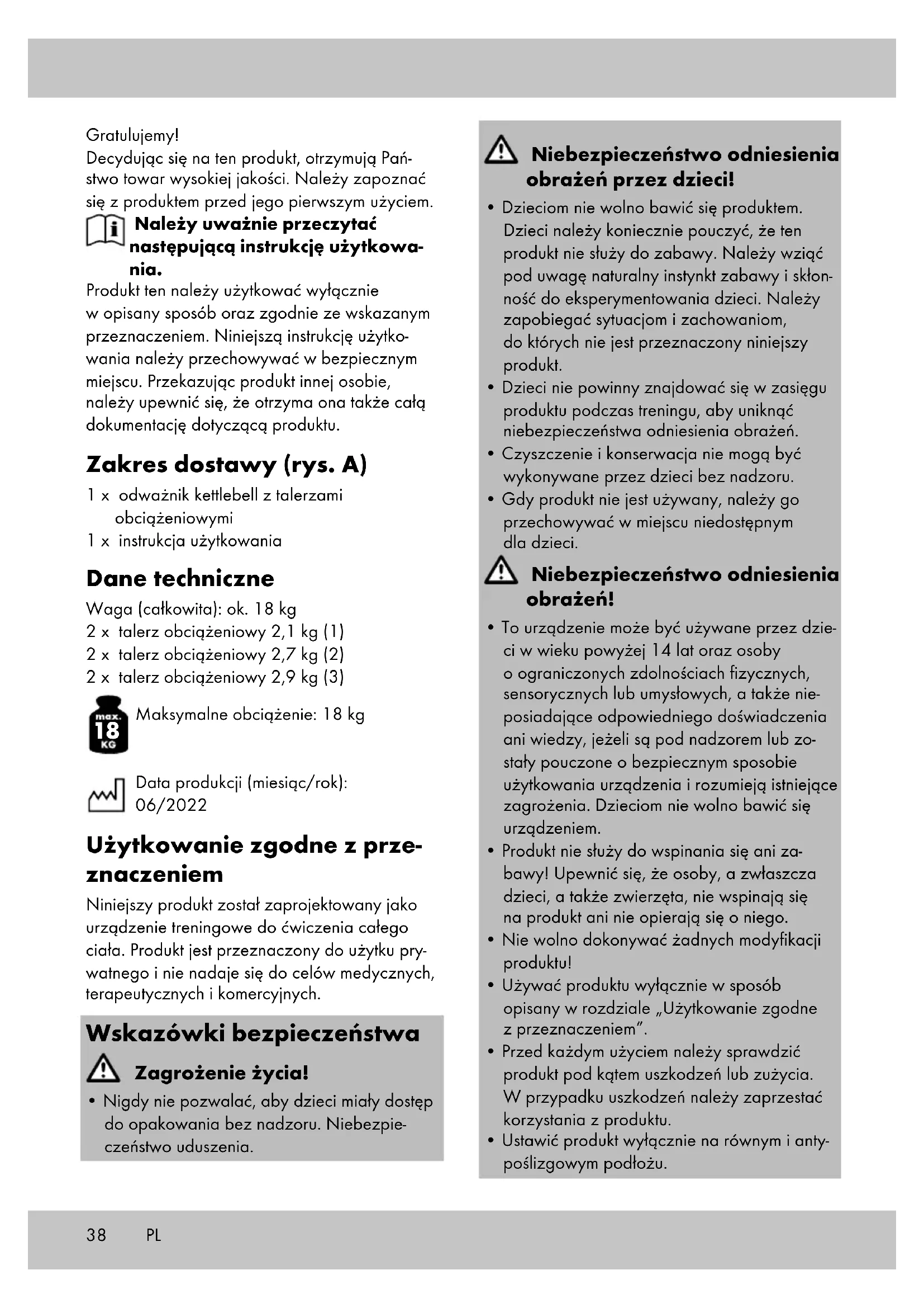 Maksymalne obciążenie: 18 kg Data produkcji (miesiąc/rok): 06/2022 Użytkowanie zgodne z prze- znaczeniem Niniejszy produkt został zaprojektowany jako urządzenie treningowe do ćwiczenia całego ciała. Produkt jest przeznaczony do użytku pry- watnego i nie nadaje się do celów medycznych, terapeutycznych i komercyjnych. Wskazówki bezpieczeństwa Zagrożenie życia!