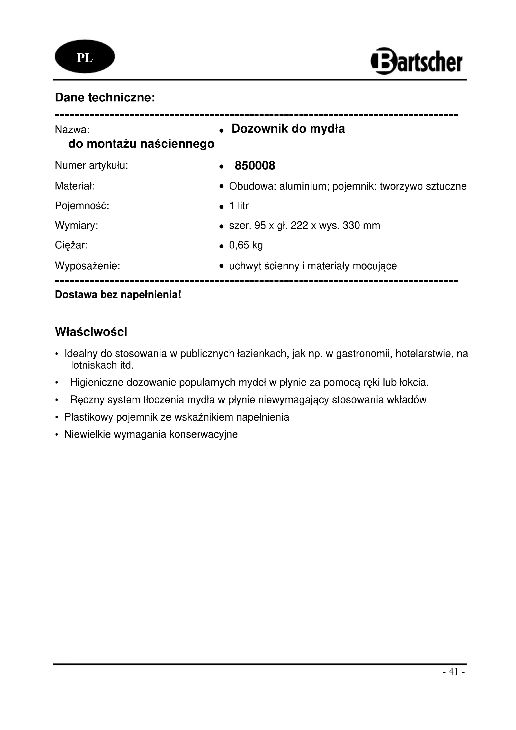 850008 - Dozownik mydła BARTSCHER - Bezpłatna instrukcja obsługi