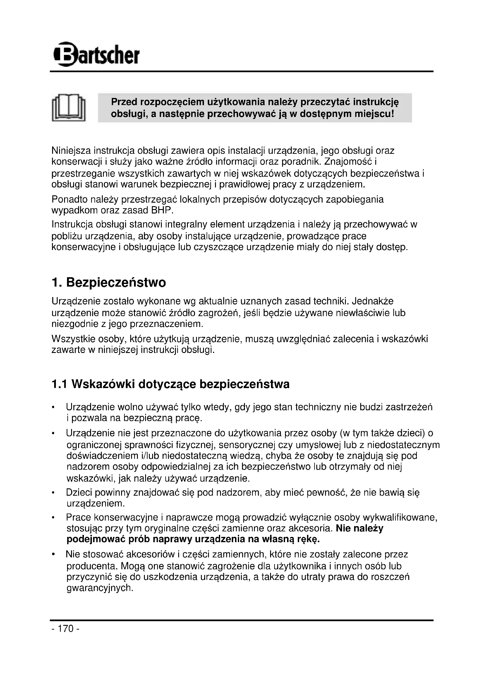 Bartscher GmbH Franz-Kleine-Str. 28 D-33154 Salzkotten Tel.: +49 (0) 5258 971-0 Germany Fax: +49 (0) 5258 971-120- 169 - POLSKI Tłumaczenie oryginalnej instrukcji obsługi