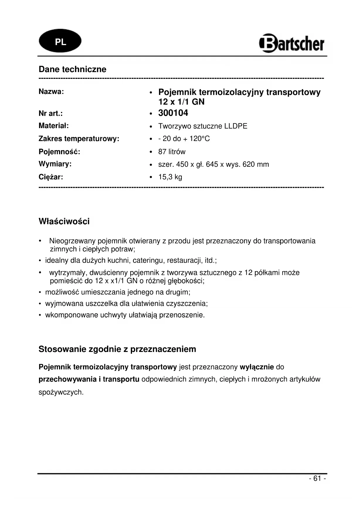 300104 - Pojemnik na żywność BARTSCHER - Bezpłatna instrukcja obsługi