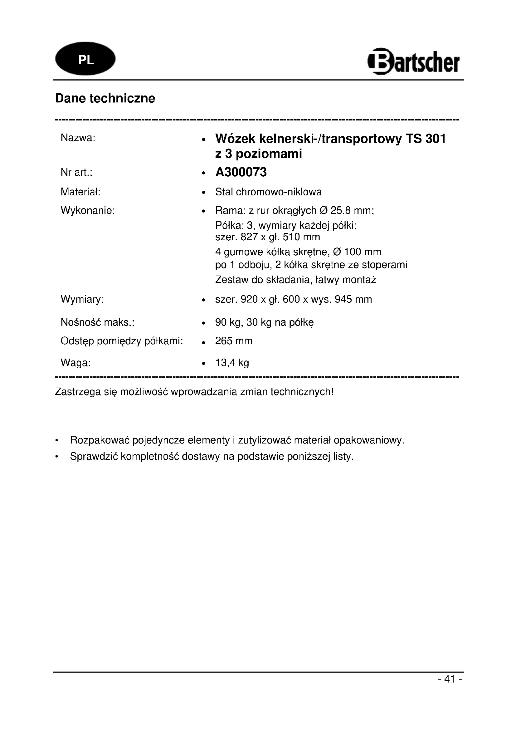 TS301 - Wózek transportowy BARTSCHER - Bezpłatna instrukcja obsługi