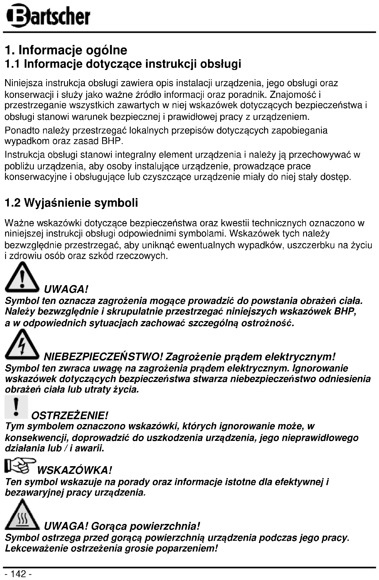 Ważne wskazówki dotyczące bezpieczeństwa oraz kwestii technicznych oznaczono w niniejszej instrukcji obsługi odpowiednimi symbolami. Wskazówek tych należy bezwzględnie przestrzegać, aby uniknąć ewentualnych wypadków, uszczerbku na życiu i zdrowiu osób oraz szkód rzeczowych. UWAGA! Symbol ten oznacza zagrożenia mogące prowadzić do powstania obrażeń ciała. Należy bezwzględnie i skrupulatnie przestrzegać niniejszych wskazówek BHP, a w odpowiednich sytuacjach zachować szczególną ostrożność. NIEBEZPIECZEŃSTWO! Zagrożenie prądem elektrycznym! Symbol ten zwraca uwagę na zagrożenia prądem elektrycznym. Ignorowanie wskazówek dotyczących bezpieczeństwa stwarza niebezpieczeństwo odniesienia obrażeń ciała lub utraty życia. OSTRZEŻENIE! Tym symbolem oznaczono wskazówki, których ignorowanie może, w konsekwencji, doprowadzić do uszkodzenia urządzenia, jego nieprawidłowego działania lub / i awarii. WSKAZÓWKA! Ten symbol wskazuje na porady oraz informacje istotne dla efektywnej i bezawaryjnej pracy urządzenia. UWAGA! Gorąca powierzchnia! Symbol ostrzega przed gorącą powierzchnią urządzenia podczas jego pracy. Lekceważenie ostrzeżenia grosie poparzeniem!- 143 -