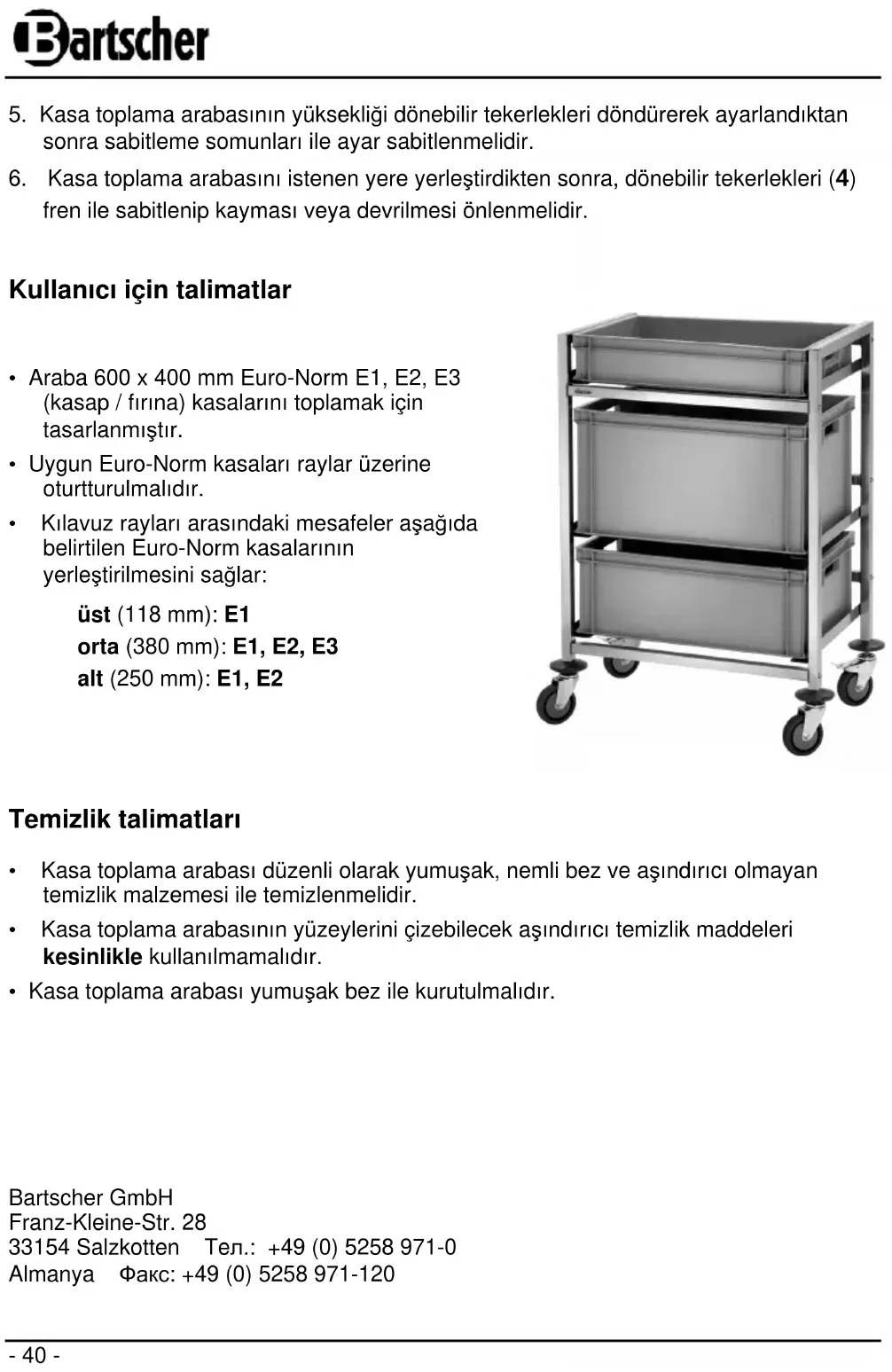 - Odstępy pomiędzy prowadnicami w wózku do sprzątania skrzyń umożliwiają używanie następujących skrzyń Euro-Norm: do góry (118 mm): E1 na środku (380 mm): E1, E2, E3 na dole (250 mm): E1, E2