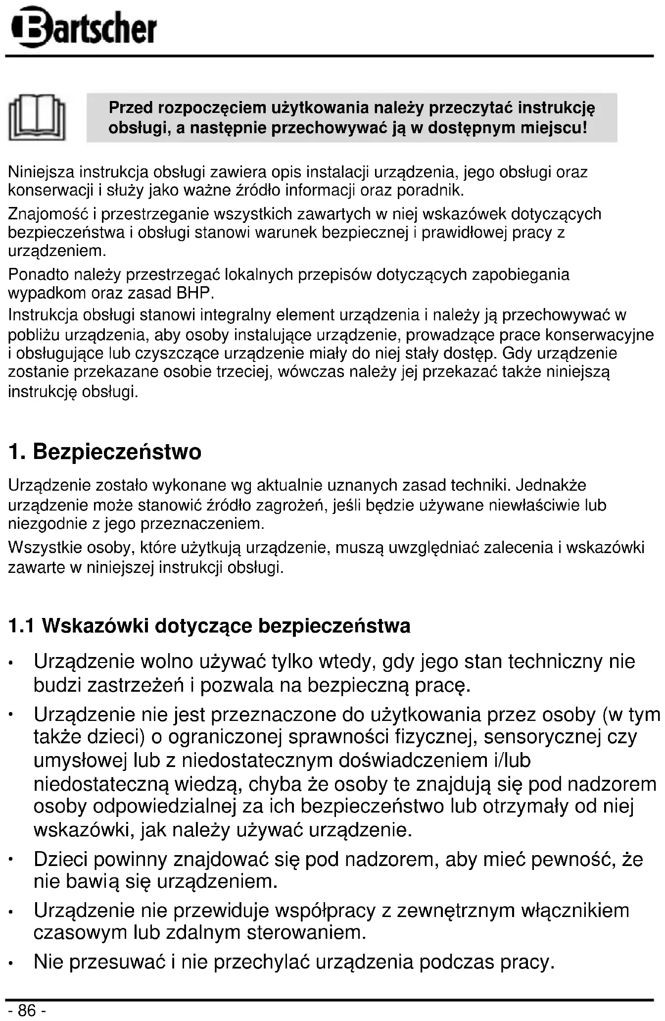Bartscher GmbH Franz-Kleine-Str. 28 D-33154 Salzkotten Tel.: +49 (0) 5258 971-0 Germany Fax: +49 (0) 5258 971-120- 85 - POLSKI Tłumaczenie oryginalnej instrukcji obsługi