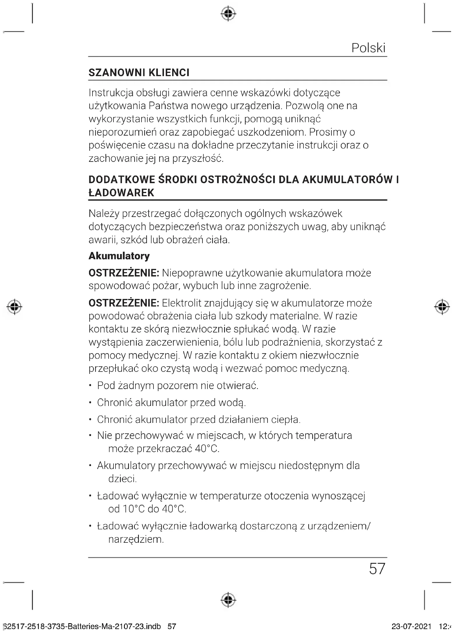 - Ładować wyłącznie ładowarką dostarczoną z urządzeniem/ narzędziem. 7062517-2518-3735-Batteries-Ma-2107-23.indb 577062517-2518-3735-Batteries-Ma-2107-23.indb 57 23-07-2021 12:4323-07-2021 12:43Polski