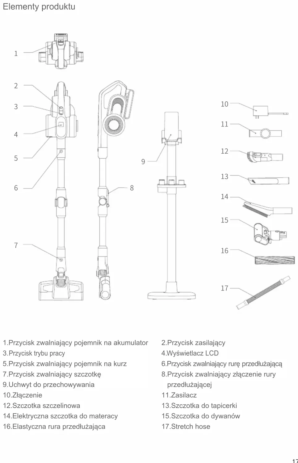 Wyświetlacz LCD 6.Przycisk zwalniający rurę przedłużającą 8.Przycisk zwalniający złączenie rury przedłużającej 11.Zasilacz 13.Szczotka do tapicerki 15.Szczotka do dywanów 17.Stretch hose