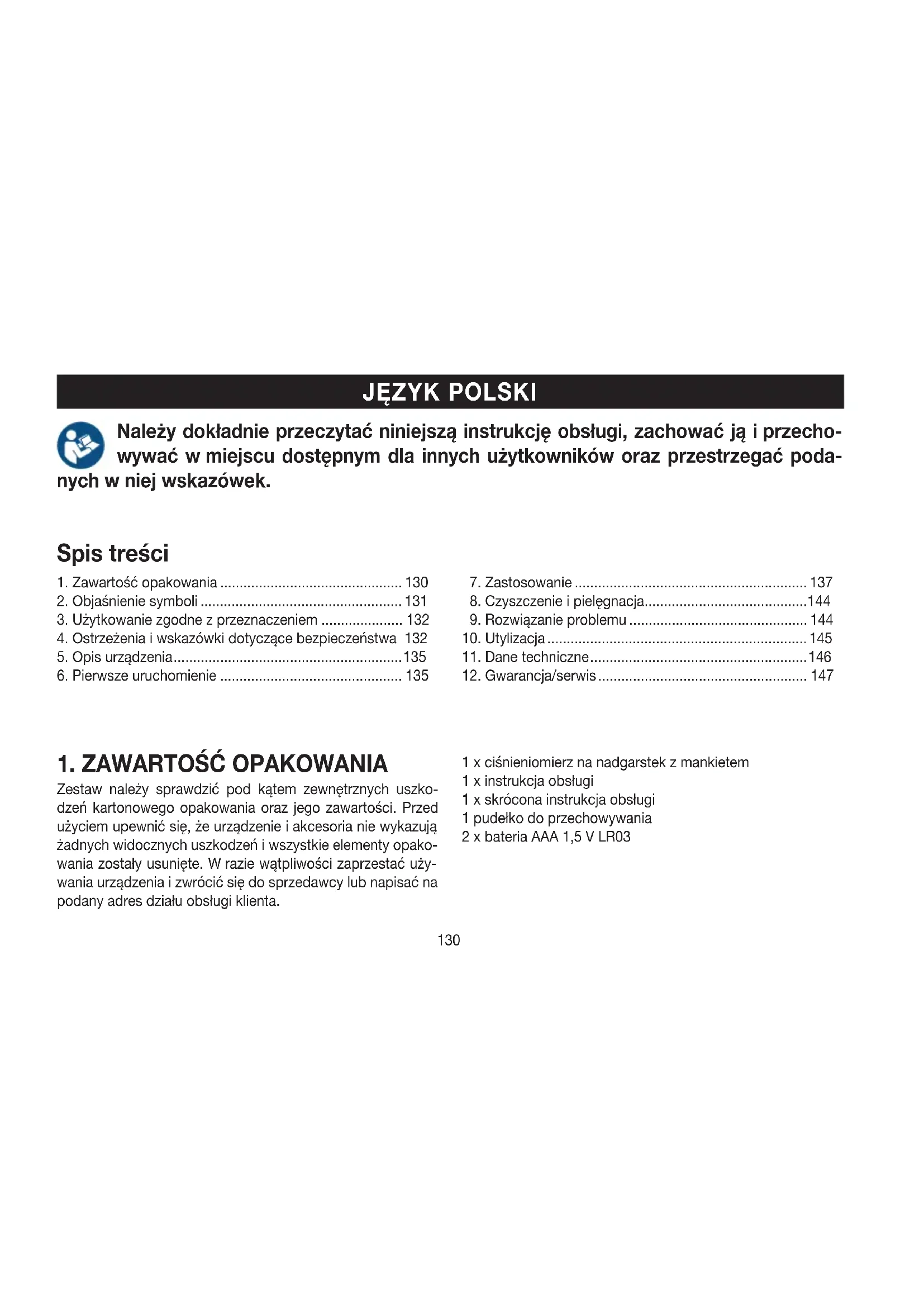 Zestaw należy sprawdzić pod kątem zewnętrznych uszko- dzeń kartonowego opakowania oraz jego zawartości. Przed użyciem upewnić się, że urządzenie iakcesoria nie wykazują żadnych widocznych uszkodzeń iwszystkie elementy opako- wania zostały usunięte. Wrazie wątpliwości zaprzestać uży- wania urządzenia izwrócić się do sprzedawcy lub napisać na podany adres działu obsługi klienta. 1 xciśnieniomierz na nadgarstek zmankietem 1 xinstrukcja obsługi 1 xskrócona instrukcja obsługi 1 pudełko do przechowywania 2 xbateria AAA 1,5VLR03131