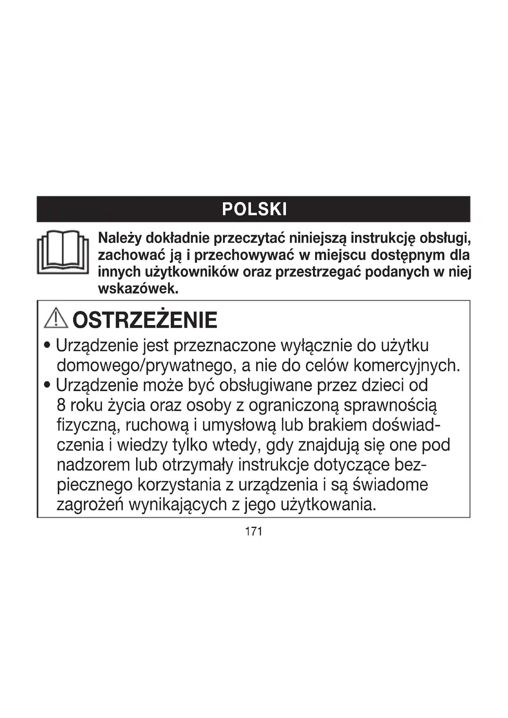 Более подробную информацию о гарантии и условиях гарантии см. в прилагаемом гарантийном листе.171 Należy dokładnie przeczytać niniejszą instrukcję obsługi, zachować ją iprzechowywać wmiejscu dostępnym dla innych użytkowników oraz przestrzegać podanych wniej wskazówek. POLSKI OSTRZEŻENIE