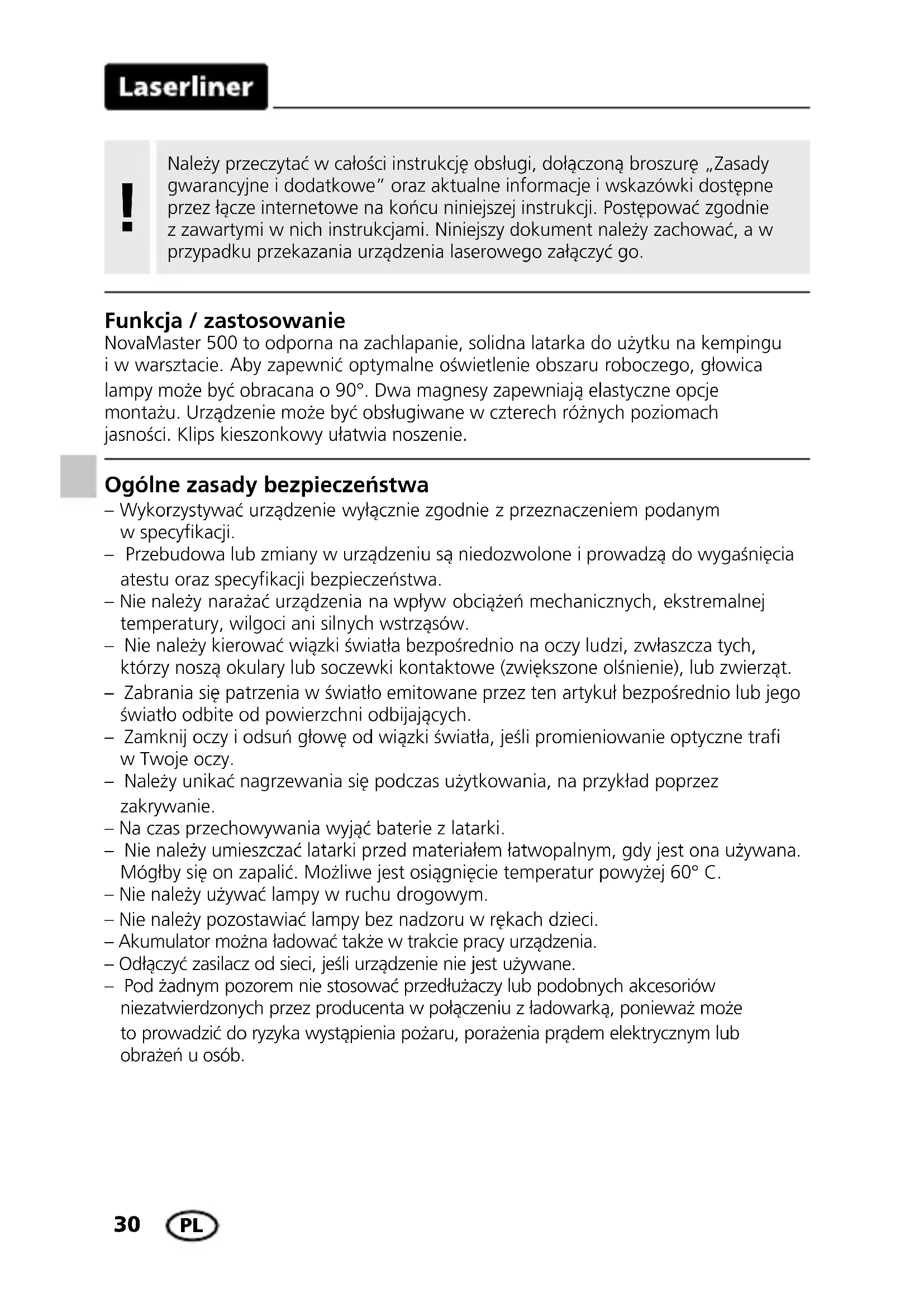 Ogólne zasady bezpieczeństwa – Wykorzystywać urządzenie wyłącznie zgodnie z przeznaczeniem podanym w specyfikacji. – Przebudowa lub zmiany w urządzeniu są niedozwolone i prowadzą do wygaśnięcia atestu oraz specyfikacji bezpieczeństwa. – Nie należy narażać urządzenia na wpływ obciążeń mechanicznych, ekstremalnej temperatury, wilgoci ani silnych wstrząsów. – Nie należy kierować wiązki światła bezpośrednio na oczy ludzi, zwłaszcza tych, którzy noszą okulary lub soczewki kontaktowe (zwiększone olśnienie), lub zwierząt. – Zabrania się patrzenia w światło emitowane przez ten artykuł bezpośrednio lub jego światło odbite od powierzchni odbijających. – Zamknij oczy i odsuń głowę od wiązki światła, jeśli promieniowanie optyczne tra w Twoje oczy. – Należy unikać nagrzewania się podczas użytkowania, na przykład poprzez zakrywanie. – Na czas przechowywania wyjąć baterie z latarki. – Nie należy umieszczać latarki przed materiałem łatwopalnym, gdy jest ona używana. Mógłby się on zapalić. Możliwe jest osiągnięcie temperatur powyżej 60° C. – Nie należy używać lampy w ruchu drogowym. – Nie należy pozostawiać lampy bez nadzoru w rękach dzieci. – Akumulator można ładować także w trakcie pracy urządzenia. – Odłączyć zasilacz od sieci, jeśli urządzenie nie jest używane. – Pod żadnym pozorem nie stosować przedłużaczy lub podobnych akcesoriów niezatwierdzonych przez producenta wpołączeniu zładowarką, ponieważ może to prowadzić do ryzyka wystąpienia pożaru, porażenia prądem elektrycznym lub obrażeń uosób. Funkcja / zastosowanie NovaMaster 500 to odporna na zachlapanie, solidna latarka do użytku na kempingu i w warsztacie. Aby zapewnić optymalne oświetlenie obszaru roboczego, głowica lampy może być obracana o 90°. Dwa magnesy zapewniają elastyczne opcje montażu. Urządzenie może być obsługiwane w czterech różnych poziomach jasności. Klips kieszonkowy ułatwia noszenie. Należy przeczytać wcałości instrukcję obsługi, dołączoną broszurę „Zasady gwarancyjne idodatkowe” oraz aktualne informacje iwskazówki dostępne przez łącze internetowe na końcu niniejszej instrukcji. Postępować zgodnie z zawartymi w nich instrukcjami. Niniejszy dokument należy zachować, a w przypadku przekazania urządzenia laserowego załączyć go. !NovaMaster 500