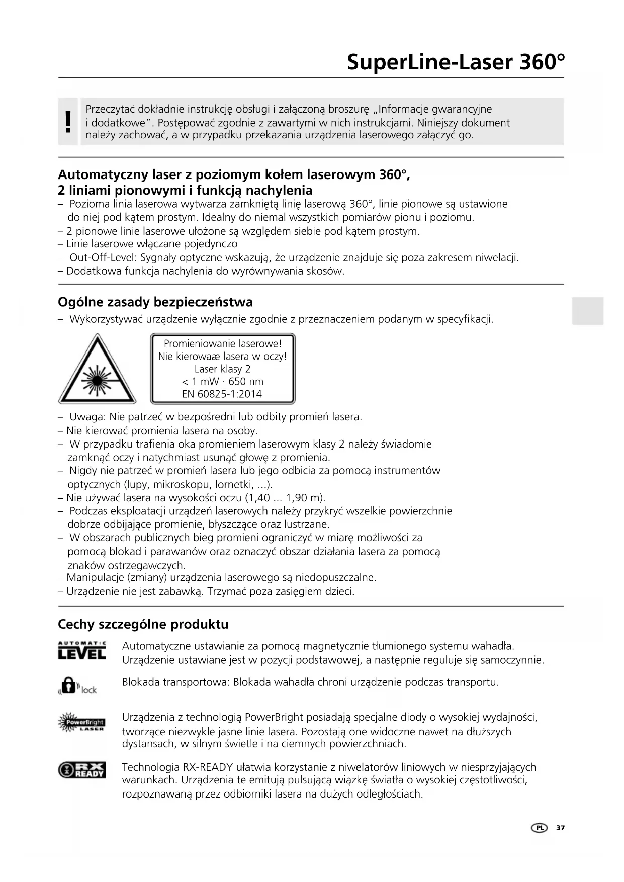 Automatyczny laser z poziomym kołem laserowym 360°, 2 liniami pionowymi i funkcją nachylenia – Pozioma linia laserowa wytwarza zamkniętą linię laserową 360°, linie pionowe są ustawione do niej pod kątem prostym. Idealny do niemal wszystkich pomiarów pionu i poziomu. – 2 pionowe linie laserowe ułożone są względem siebie pod kątem prostym. – Linie laserowe włączane pojedynczo – Out-Off-Level: Sygnały optyczne wskazują, że urządzenie znajduje się poza zakresem niwelacji. – Dodatkowa funkcja nachylenia do wyrównywania skosów. Ogólne zasady bezpieczeństwa Promieniowanie laserowe! Nie kierowaæ lasera w oczy! Laser klasy 2 < 1 mW · 650 nm EN 60825-1:2014 – Uwaga: Nie patrzeć w bezpośredni lub odbity promień lasera. – Nie kierować promienia lasera na osoby. – W przypadku traenia oka promieniem laserowym klasy 2 należy świadomie zamknąć oczy i natychmiast usunąć głowę z promienia. – Nigdy nie patrzeć w promień lasera lub jego odbicia za pomocą instrumentów optycznych (lupy, mikroskopu, lornetki, ...). – Nie używać lasera na wysokości oczu (1,40 ... 1,90 m). – Podczas eksploatacji urządzeń laserowych należy przykryć wszelkie powierzchnie dobrze odbijające promienie, błyszczące oraz lustrzane. – W obszarach publicznych bieg promieni ograniczyć w miarę możliwości za pomocą blokad i parawanów oraz oznaczyć obszar działania lasera za pomocą znaków ostrzegawczych. – Manipulacje (zmiany) urządzenia laserowego są niedopuszczalne. – Urządzenie nie jest zabawką. Trzymać poza zasięgiem dzieci. – Wykorzystywać urządzenie wyłącznie zgodnie z przeznaczeniem podanym w specykacji.