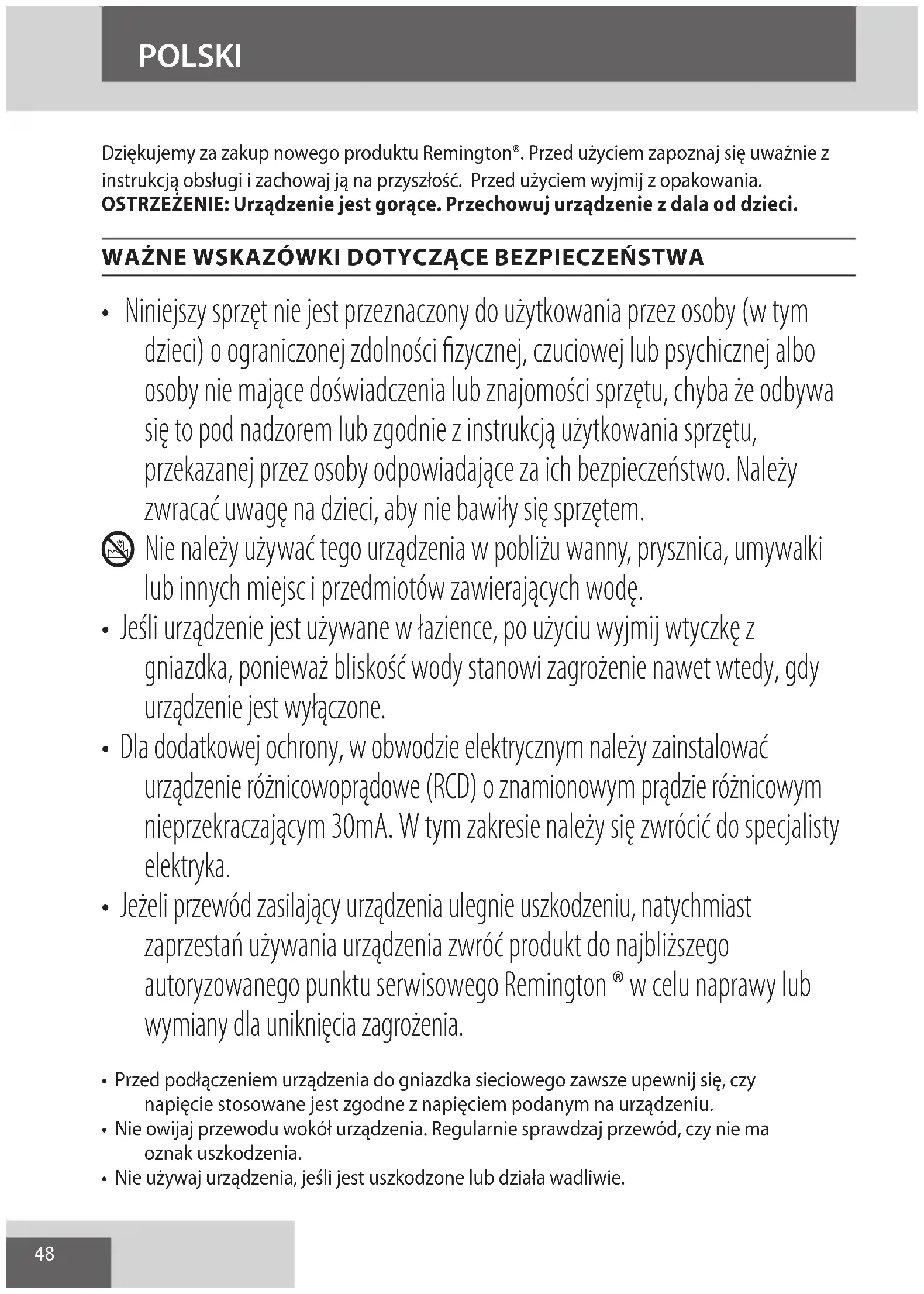 - Jeżeli przewód zasilający urządzenia ulegnie uszkodzeniu, natychmiast zaprzestań używania urządzenia zwróć produkt do najbliższego autoryzowanego punktu serwisowego Remington ® w celu naprawy lub wymiany dla uniknięcia zagrożenia.