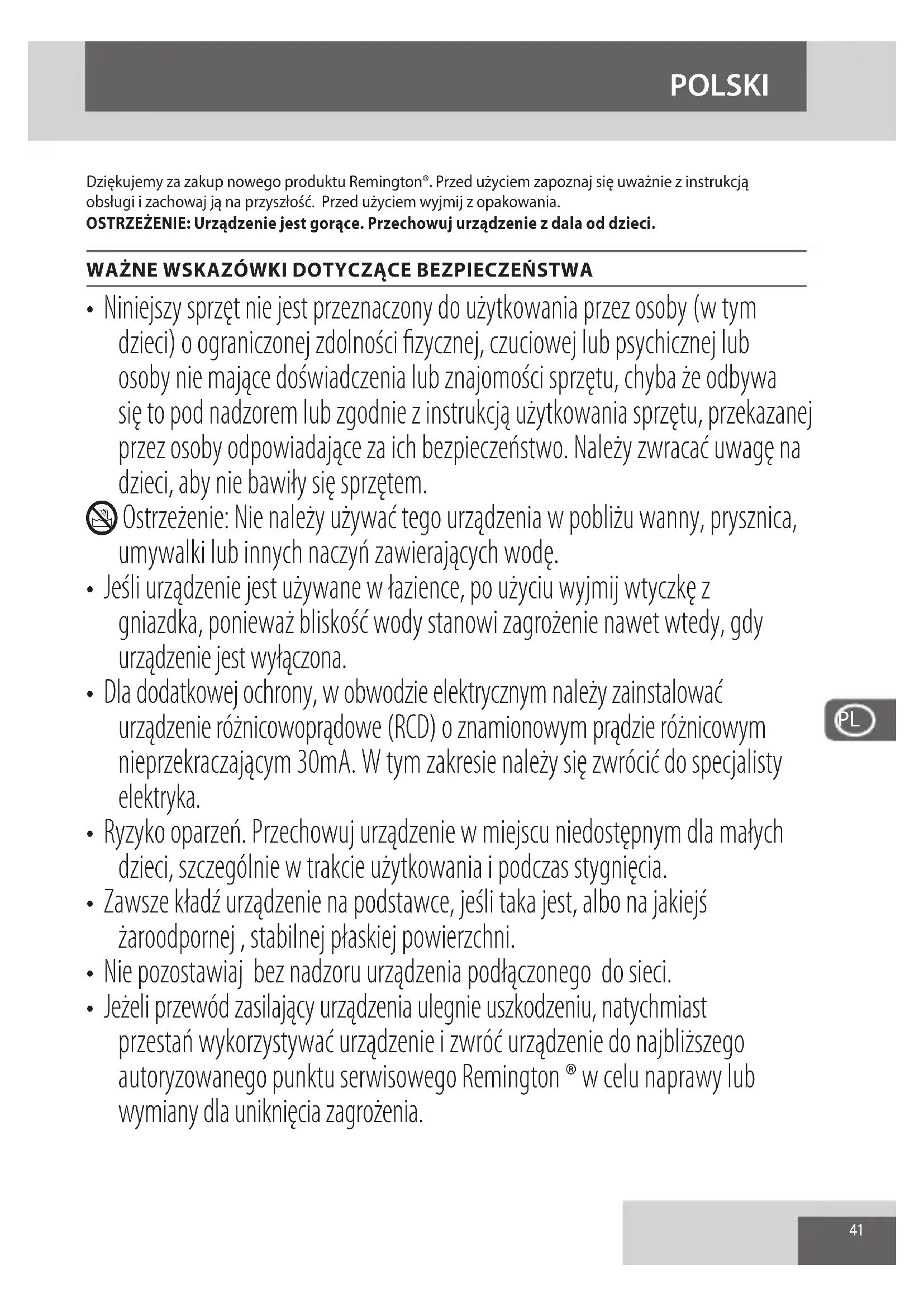- Jeżeli przewód zasilający urządzenia ulegnie uszkodzeniu, natychmiast przestań wykorzystywać urządzenie i zwróć urządzenie do najbliższego autoryzowanego punktu serwisowego Remington ® w celu naprawy lub wymiany dla uniknięcia zagrożenia.