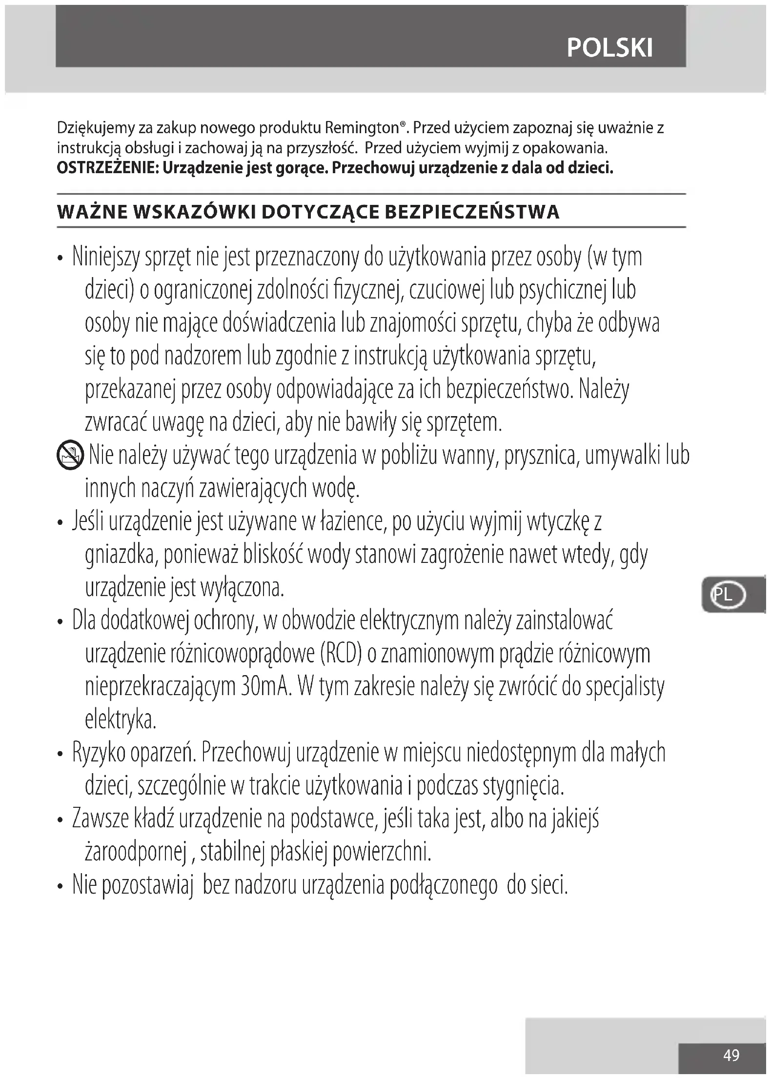 Aby uniknąć problemów środowiskowych i zdrowotnych spowodowanych niebezpiecznymi substancjami, sprzętu, akumulatorów i baterii oznaczonych jednym z tych symboli nie należy wyrzucać z nieposortowanymi odpadami komunalnymi. Produkty elektryczne i elektroniczne, w tym, baterie jednorazowe i akumulatory, należy zawsze utylizować w odpowiednim publicznym punkcie zbiórki odpadów/recyklingu.53 Köszönjük, hogy ezt az új Remington® terméket választotta. Kérjük, olvassa el és őrizze meg a jelen utasítást. Használat előtt távolítsa el a csomagolóanyagokat. FIGYELMEZTETÉS: A készülék forró. Gyermekek elől mindig elzárva tartandó.