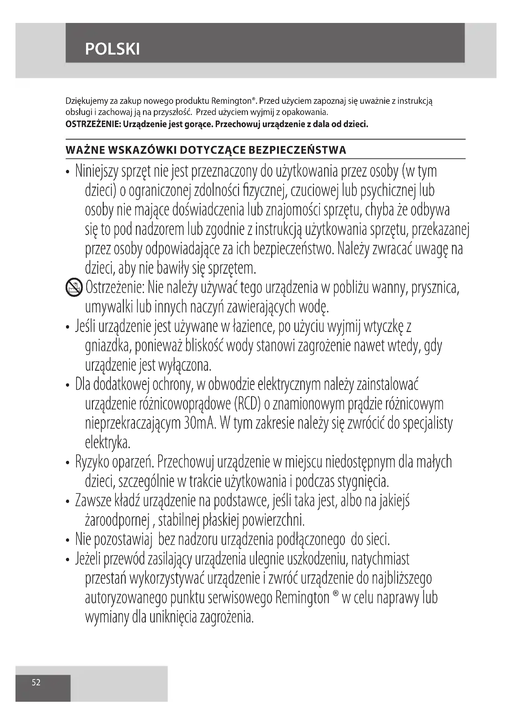 - Jeżeli przewód zasilający urządzenia ulegnie uszkodzeniu, natychmiast przestań wykorzystywać urządzenie i zwróć urządzenie do najbliższego autoryzowanego punktu serwisowego Remington ® w celu naprawy lub wymiany dla uniknięcia zagrożenia.53 POLSKI