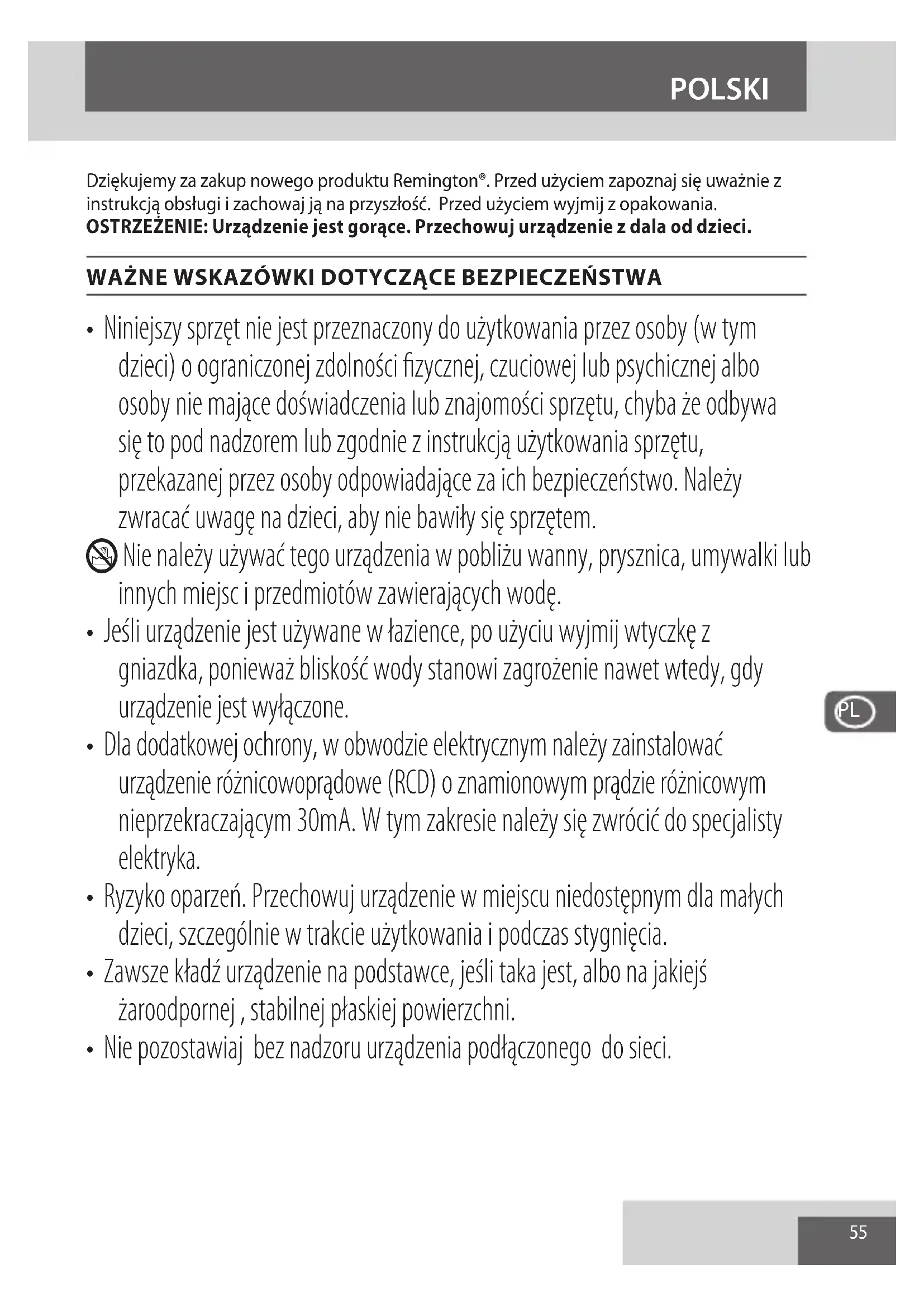 - Jeżeli przewód zasilający urządzenia ulegnie uszkodzeniu, natychmiast zaprzestań używania urządzenia i zwróć produkt do najbliższego autoryzowanego punktu serwisowego Remington ® w celu naprawy lub wymiany dla uniknięcia zagrożenia.