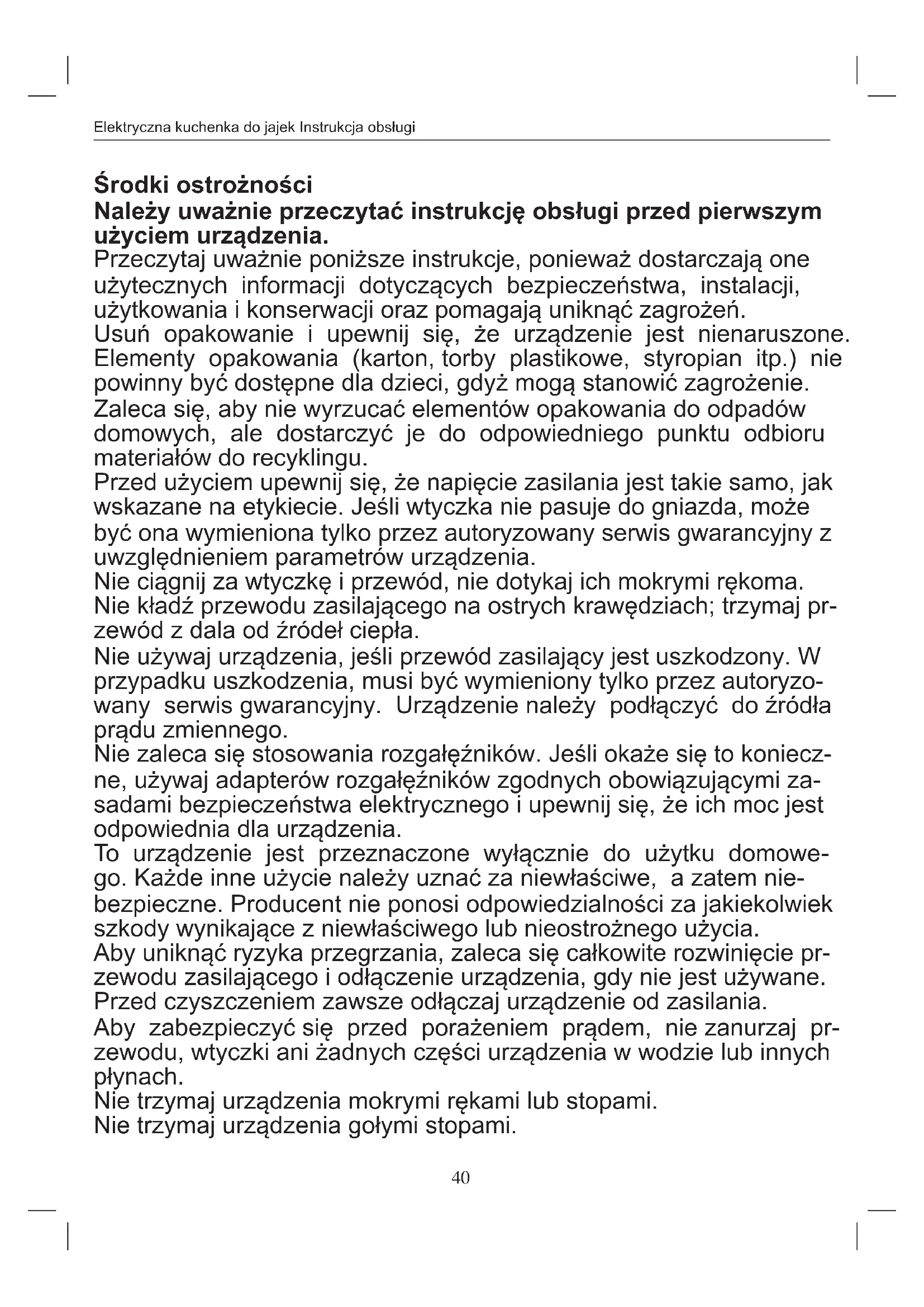 Środki ostrożności Ostrzeżenie: ryzyko poparzenia! Podczas pracy temperatura powierzchni urządzenia może być bardzo gorąca. Nie przestawiaj urządzenia i nie dotykaj go podczas pracy. Zdejmij pokrywę z urządzenia dopiero po zakończeniu procesu gotowania. Trzymaj pokrywę i uchwyt na jajka tylko za uchwyty. Gorąca para wydobywa się z otworu pary i podczas otwierania pokrywy. Ryzyko poparzenia! Ostrożnie obchodź się z miarką. Ma zainstalowany przebijacz jaj. Ryzyko zranienia! Upewnij się, że przewód zasilający nie dotyka gorących części urządzenia. Nie uruchamiaj urządzenia bez wody. Napełniaj urządzenie tylko zimną wodą. Nie nalewaj środków odkamieniających na gorącą płytę grzejną. Instalacja Ostrożnie wyjmij wszystkie części z opakowania. Upewnij się, że zasilanie sieciowe odpowiada specykacjom urządzenia podanym na tabliczce znamionowej. Przed pierwszym użyciem napełnij płytę wodą, zagotuj ją dwa razy i wylej resztki wody. Uruchomienie Umieść urządzenie na płaskiej, stabilnej i suchej powierzchni. Powierzchnia powinna być antypoślizgowa i odporna na ciepło. Napełnij płytę wodą zgodnie ze wskazówkami oznaczonymi na miarce, aby określić poziom wody i liczbę jaj do ugotowania “Fig.B”. Umieść uchwyt na jajka na płycie.42 Elektryczna kuchenka do jajek Instrukcja obsługi Aby uniknąć pękania jaj podczas gotowania, przekłuj każde jajko od spodu przy pomocy przebijaka do jaj umieszczonego na dole miarki. Ostrożnie naciśnij dno jajka na przebijaku. Umieść jaja równomiernie na uchwycie na jajka. Załóż pokrywę. Podłącz urządzenie i naciśnij przycisk włączania / wyłączania. Przycisk przełącznika zaświeci się. Gdy proces gotowania się zakończy, urządzenie wyłączy się automatycznie i rozlegnie się dźwięk. Po zakończeniu gotowania odłącz urządzenie od zasilania. Zdejmij pokrywę, wyjmując ją z uchwytu. Ostrzeżenie: niebezpieczeństwo poparzenia! Wyjmij pojemnik na jajka z urządzenia i schłodź pod zimną wodą. Pozwól urządzeniu całkowicie ostygnąć przed dalszym użyciem lub przechowywaniem. Uwaga Ponieważ stopień gotowania zależy od kilku czynników, zaleca się użycie nieco większej ilości wody w przypadku dużych lub zimnych jaj. Jeśli jajka są niedogotowane pod koniec procesu, napełnij płytę dodatkową ilością wody, naciśnij przycisk włączania/wyłączana, aby kontynuować gotowanie. Wyłącz urządzenie i odłącz je z zasilania, aby przerwać gotowanie w dowolnym momencie. Czyszczenie i przechowywanie Po użyciu odłącz urządzenie z gniazda elektrycznego. Nie czyść go, dopóki urządzenie nie ostygnie, aby uniknąć poparzenia! Nie zanurzaj całego urządzenia w wodzie ani nie wkładaj go pod bieżącą wodą! Nie czyść metalowymi narzędziami lub ścierną gąbką, aby uniknąć uszkodzenia powierzchni! Do czyszczenia urządzenia nie używaj agresywnych lub ściernych detergentów. Usuń resztki wody i pozostałości z urządzenia za pomocą czystej, wilgotnej szmatki. Jeśli to konieczne, oczyść powierzchnię czystą, wilgotną szmatką bez użycia detergentów. Pokrywę, pojemnik na jajka i miarkę należy czyścić gąbką wodą z mydłem lub w zmywarce, a następnie dokładnie wysuszyć. Dane techniczne Moc: 360W Zasilanie: 220-240V, 50 / 60Hz, klasa I W przypadku jakichkolwiek ulepszeń, Beper zastrzega sobie prawo do modykacji lub ulepszenia pro- duktu bez informowania.43 Elektryczna kuchenka do jajek Instrukcja obsługi