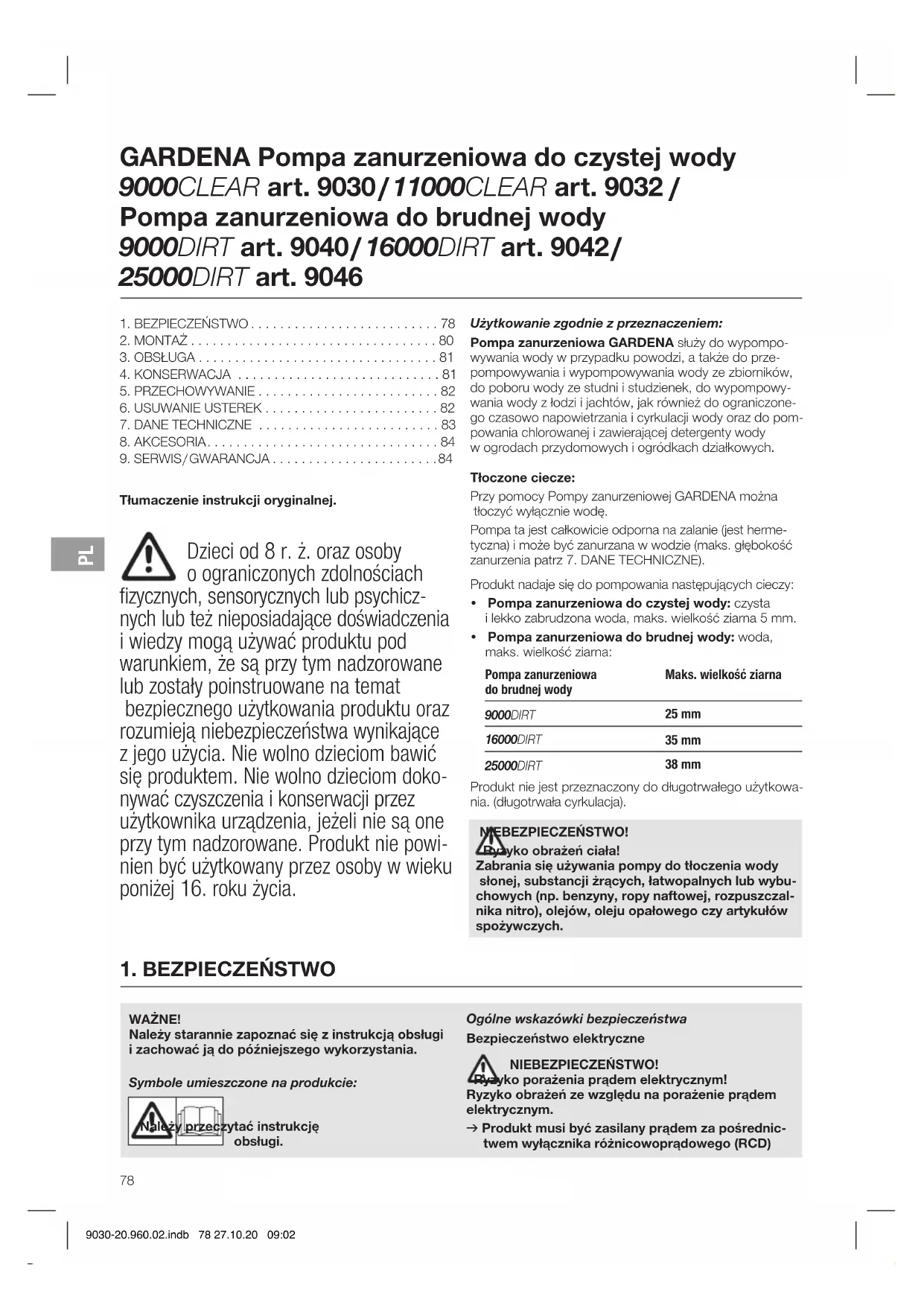 WAŻNE! Należy starannie zapoznać się zinstrukcją obsługi izachować ją do późniejszego wykorzystania. Symbole umieszczone na produkcie: Należy przeczytać instrukcję obsługi. Ogólne wskazówki bezpieczeństwa Bezpieczeństwo elektryczne NIEBEZPIECZEŃSTWO! Ryzyko porażenia prądem elektrycznym! Ryzyko obrażeń ze względu na porażenie prądem elektrycznym. v Produkt musi być zasilany prądem za pośrednic- twem wyłącznika różnicowoprądowego (RCD) GARDENA Pompa zanurzeniowa do czystej wody 9000CLEAR art. 9030 / 11000CLEAR art. 9032 / Pompa zanurzeniowa do brudnej wody 9000DIRT art. 9040 / 16000DIRT art. 9042 / 25000DIRT art. 9046