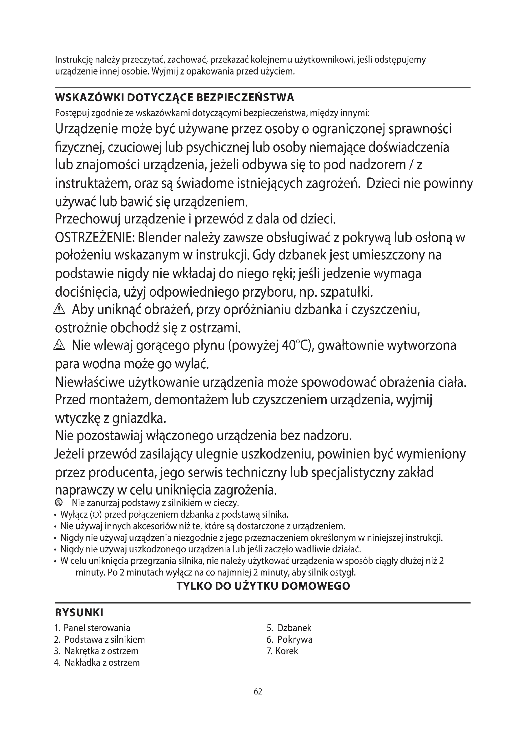 Postępuj zgodnie ze wskazówkami dotyczącymi bezpieczeństwa, między innymi: Urządzenie może być używane przez osoby o ograniczonej sprawności zycznej, czuciowej lub psychicznej lub osoby niemające doświadczenia lub znajomości urządzenia, jeżeli odbywa się to pod nadzorem / z instruktażem, oraz są świadome istniejących zagrożeń. Dzieci nie powinny używać lub bawić się urządzeniem. Przechowuj urządzenie i przewód z dala od dzieci. OSTRZEŻENIE: Blender należy zawsze obsługiwać z pokrywą lub osłoną w położeniu wskazanym w instrukcji. Gdy dzbanek jest umieszczony na podstawie nigdy nie wkładaj do niego ręki; jeśli jedzenie wymaga dociśnięcia, użyj odpowiedniego przyboru, np. szpatułki. c Aby uniknąć obrażeń, przy opróżnianiu dzbanka i czyszczeniu, ostrożnie obchodź się z ostrzami. h Nie wlewaj gorącego płynu (powyżej 40°C), gwałtownie wytworzona para wodna może go wylać. Niewłaściwe użytkowanie urządzenia może spowodować obrażenia ciała. Przed montażem, demontażem lub czyszczeniem urządzenia, wyjmij wtyczkę z gniazdka. Nie pozostawiaj włączonego urządzenia bez nadzoru. Jeżeli przewód zasilający ulegnie uszkodzeniu, powinien być wymieniony przez producenta, jego serwis techniczny lub specjalistyczny zakład naprawczy w celu uniknięcia zagrożenia. l Nie zanurzaj podstawy z silnikiem w cieczy.